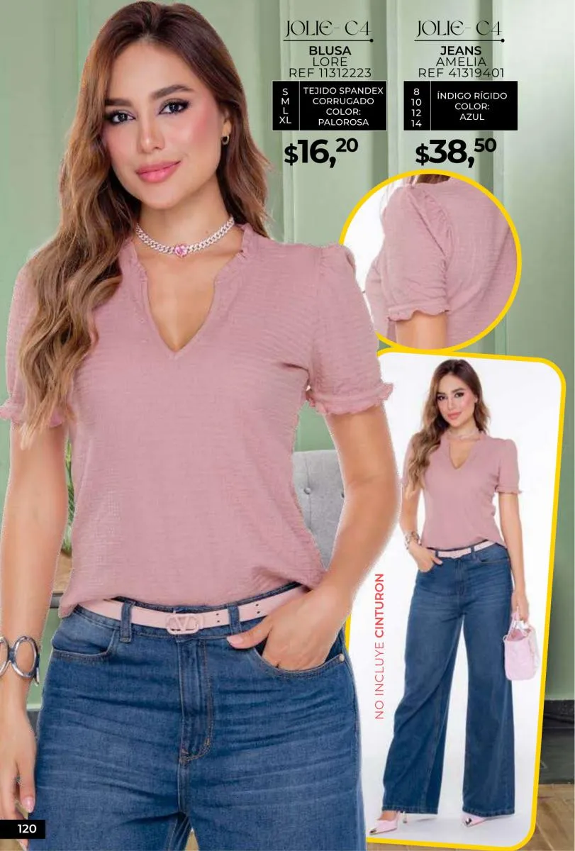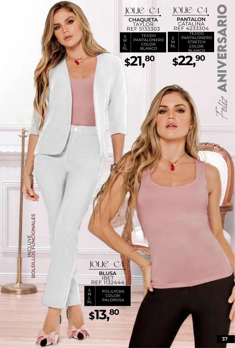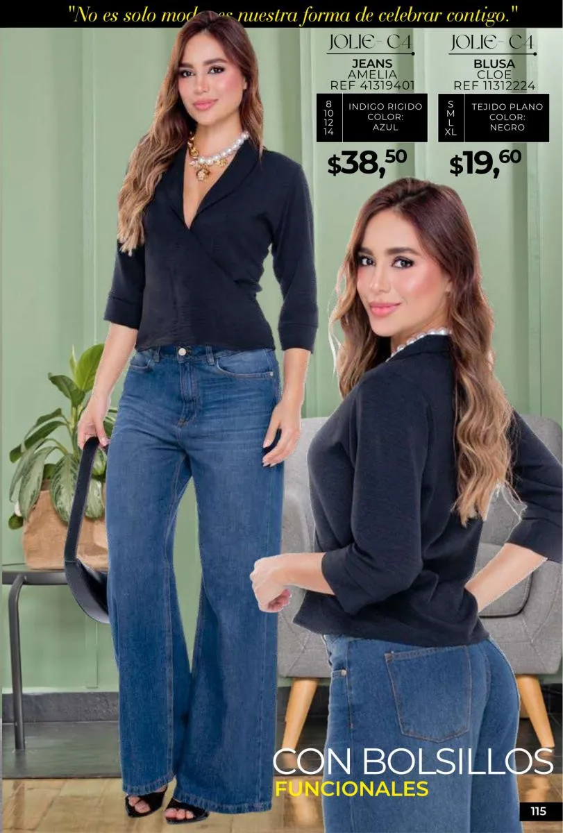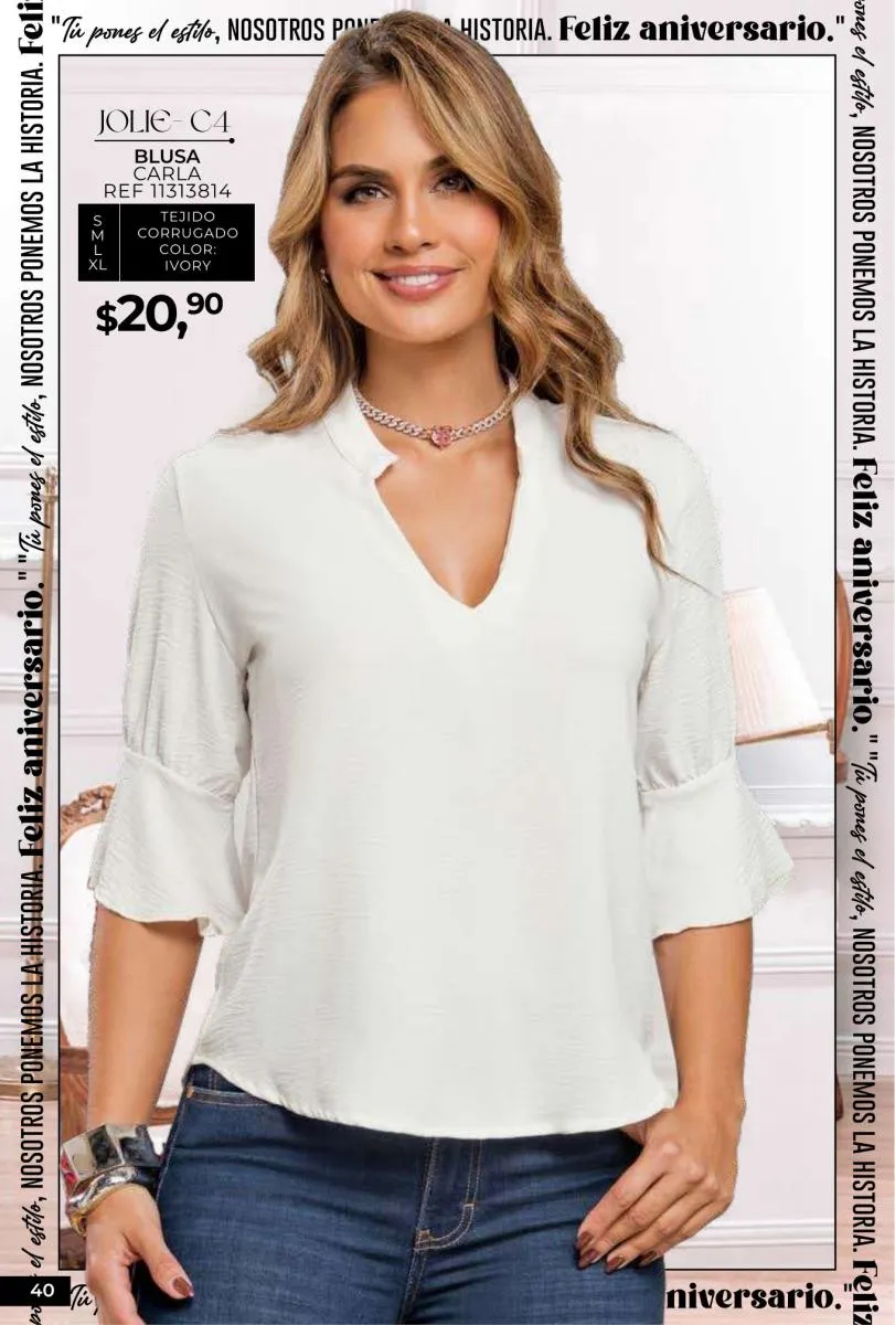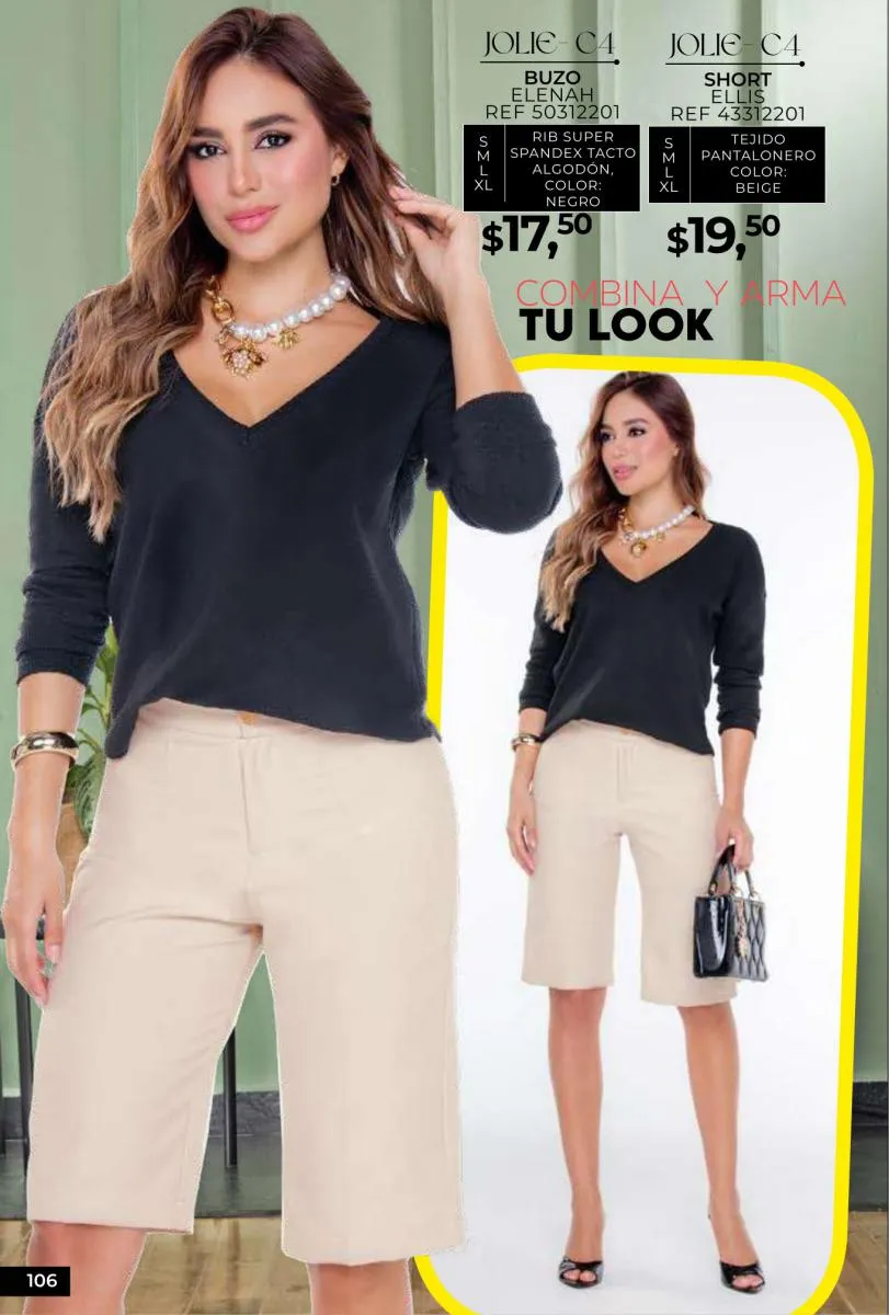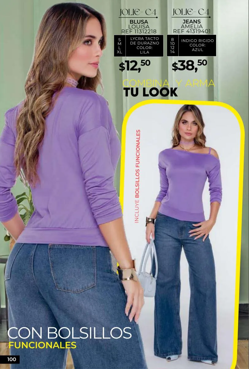 - Si de blusas se trata, hay una gran variedad en esta colección. Ejemplo de esto la de tono azul rey “Giselle”, elaborada en polilycra o la “Salmy” de manga larga y tejido plano (página 32).