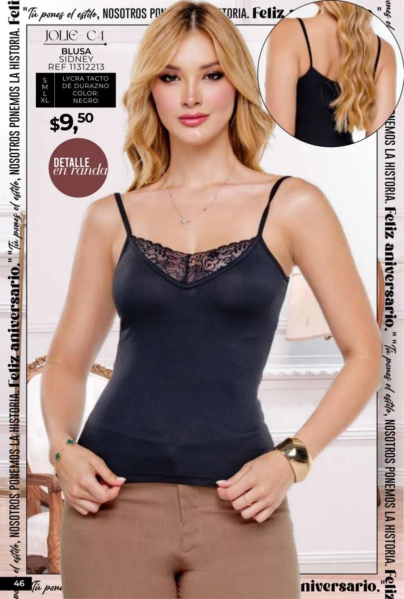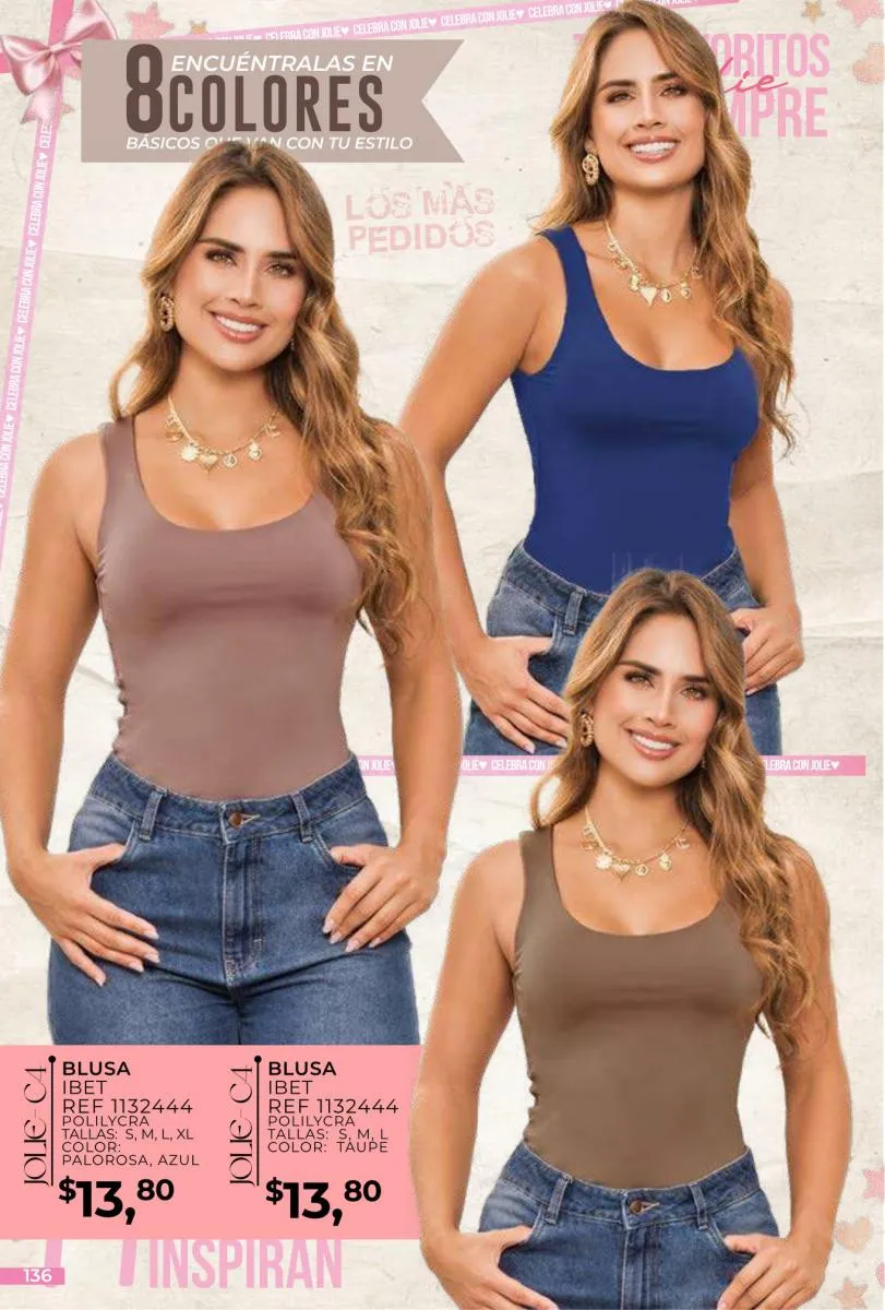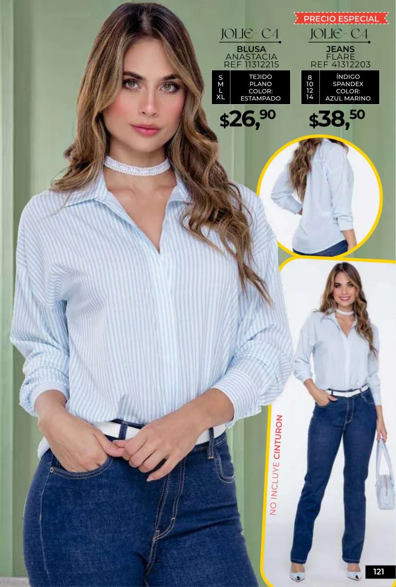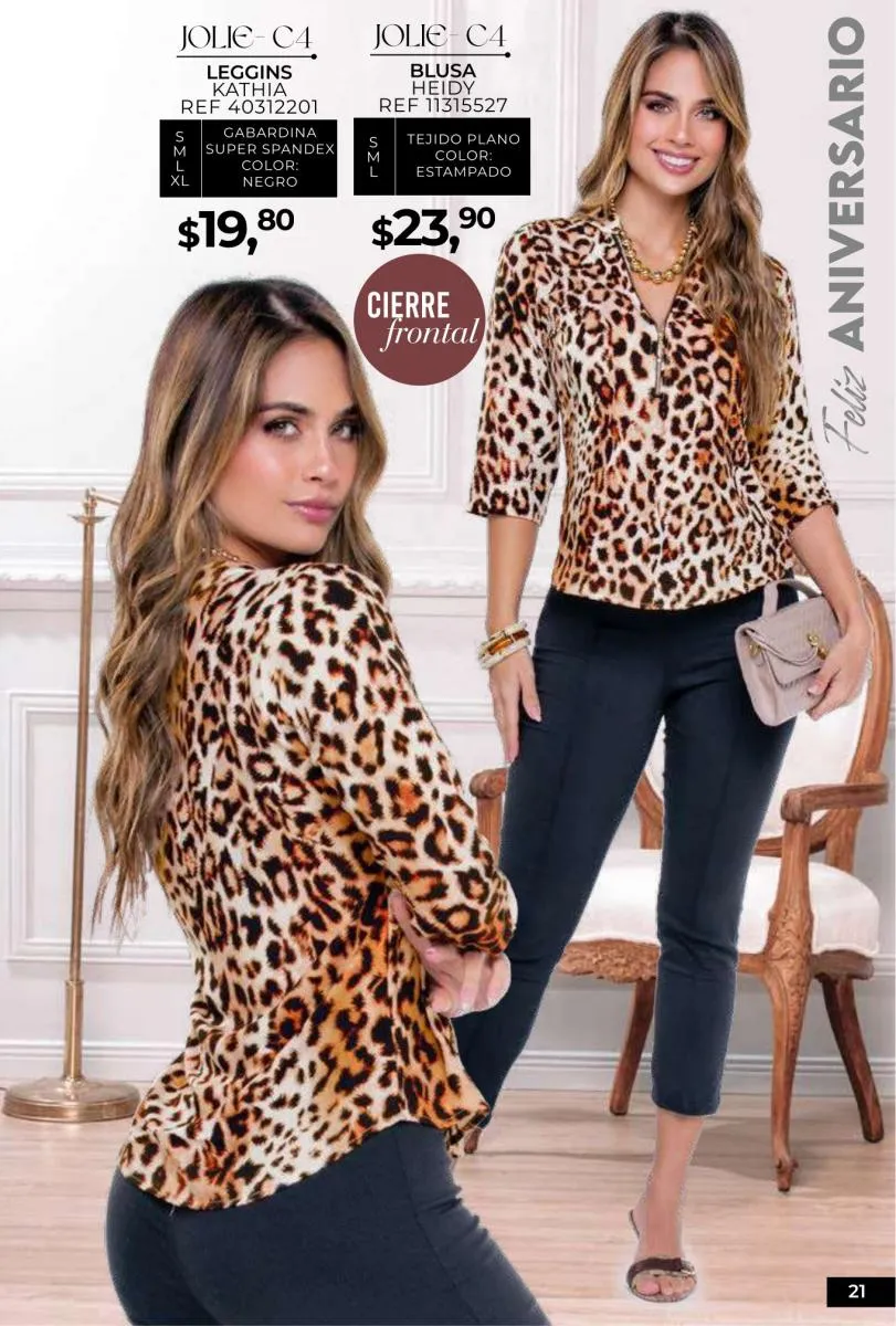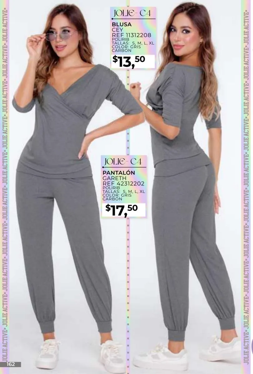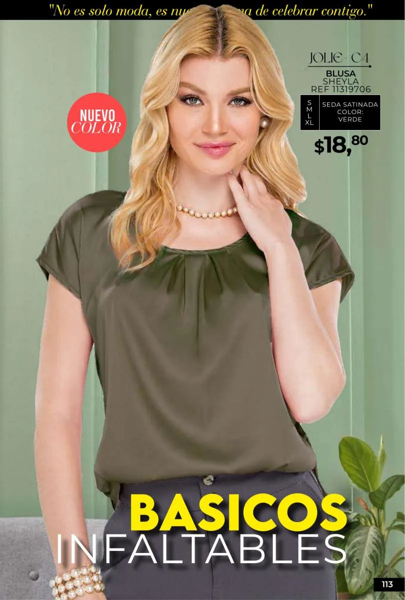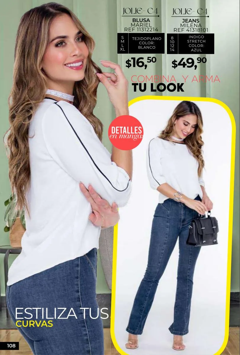 - Si de blusas se trata, hay una gran variedad en esta colección. Ejemplo de esto la de tono azul rey “Giselle”, elaborada en polilycra o la “Salmy” de manga larga y tejido plano (página 32).