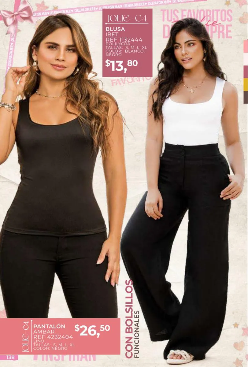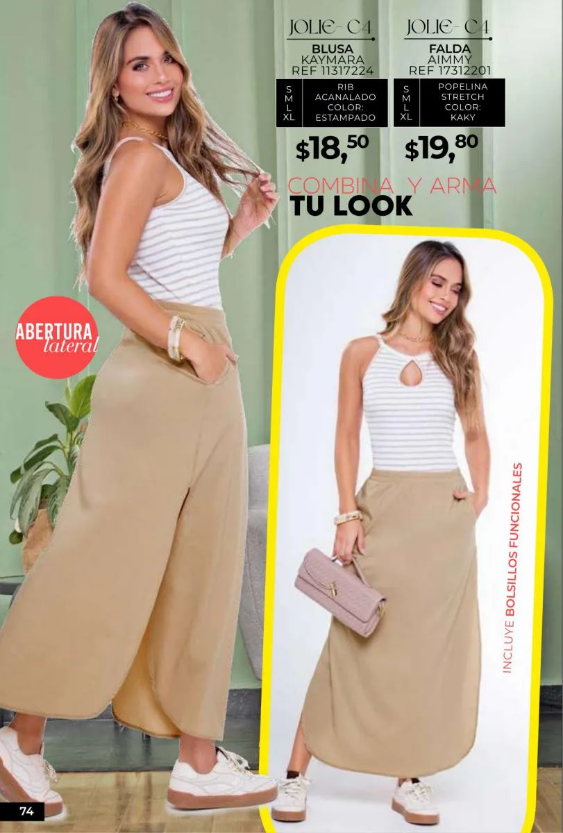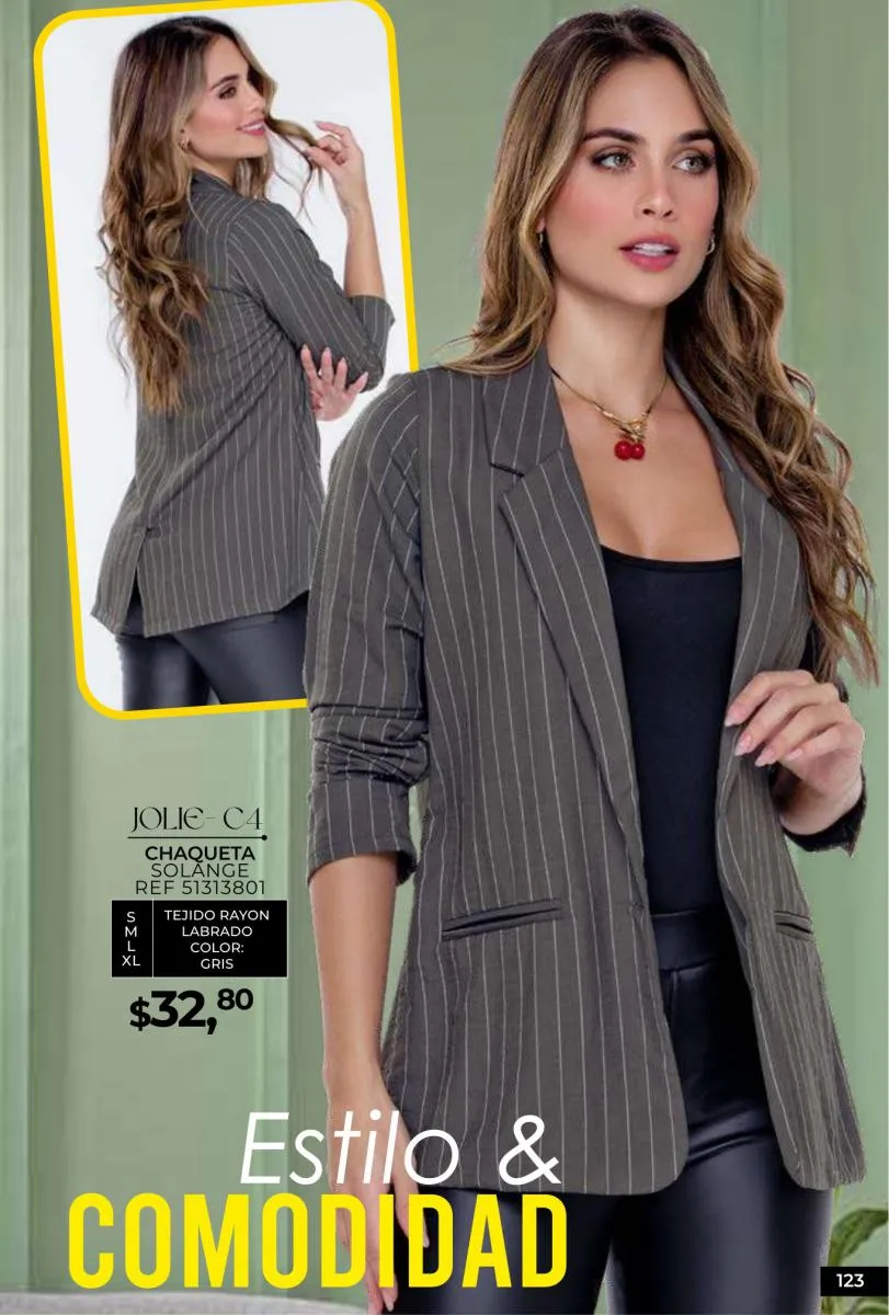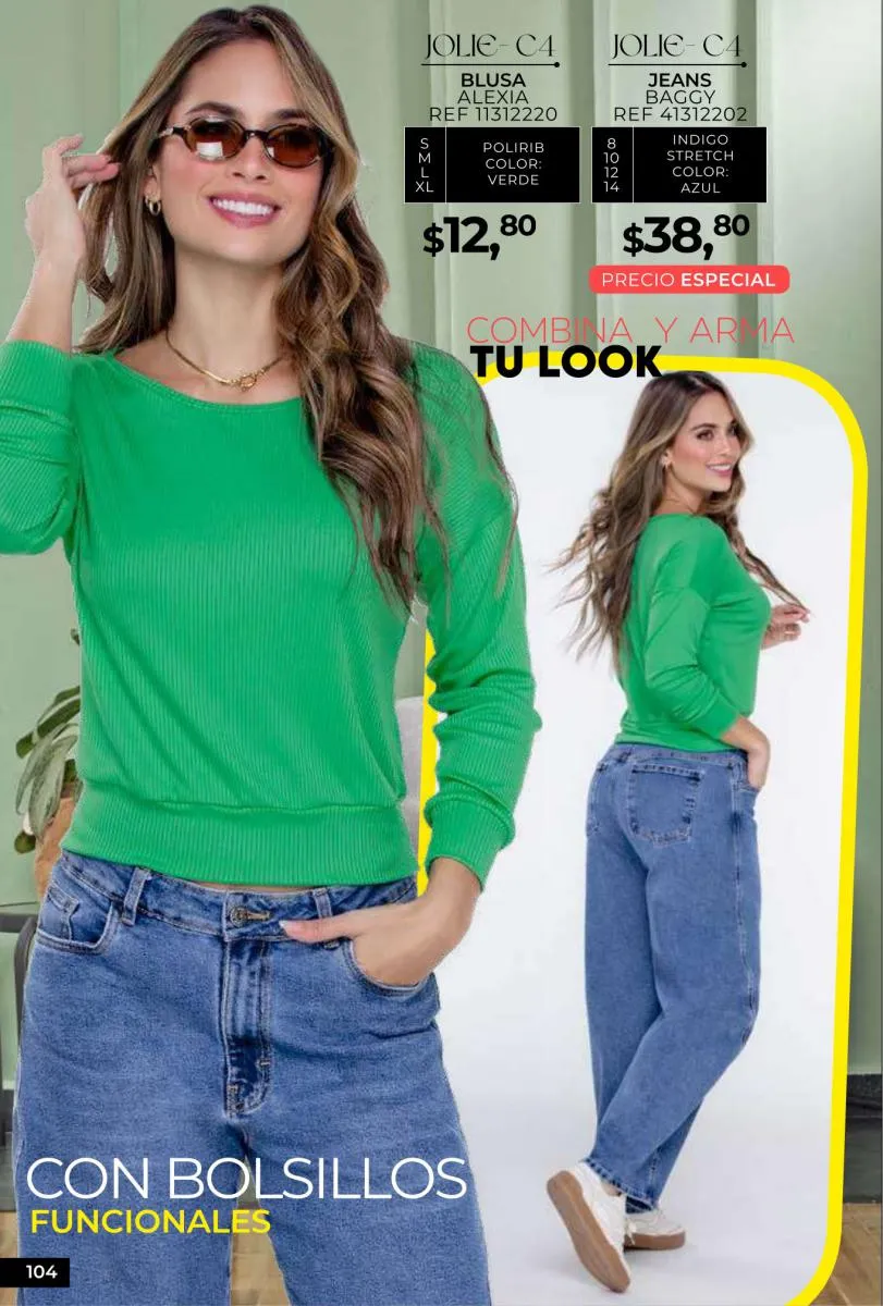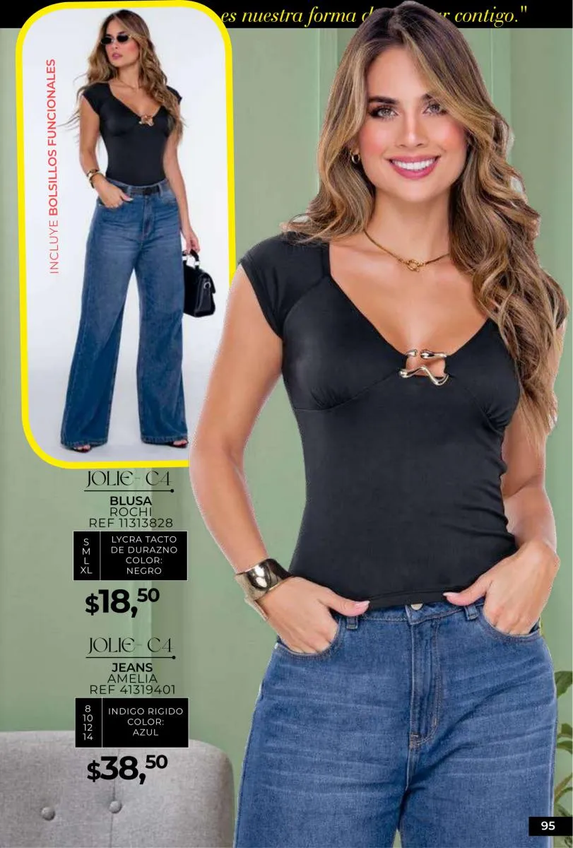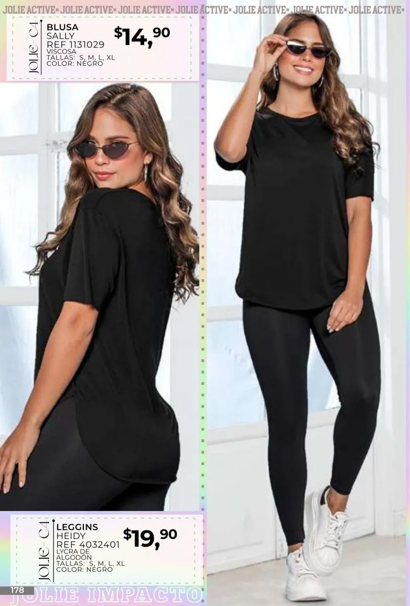 - Si de blusas se trata, hay una gran variedad en esta colección. Ejemplo de esto la de tono azul rey “Giselle”, elaborada en polilycra o la “Salmy” de manga larga y tejido plano (página 32).