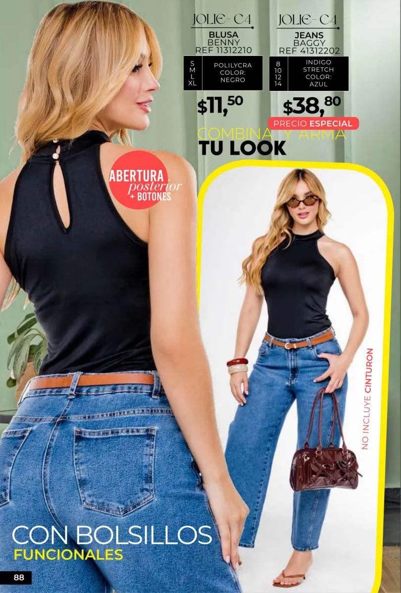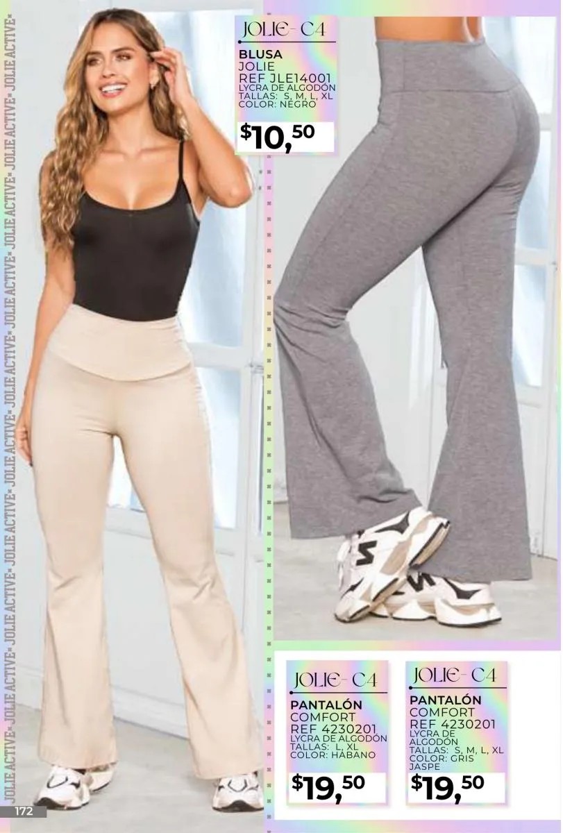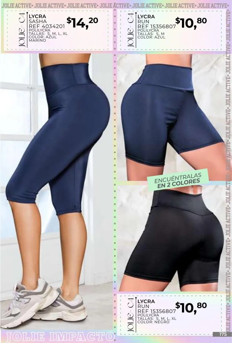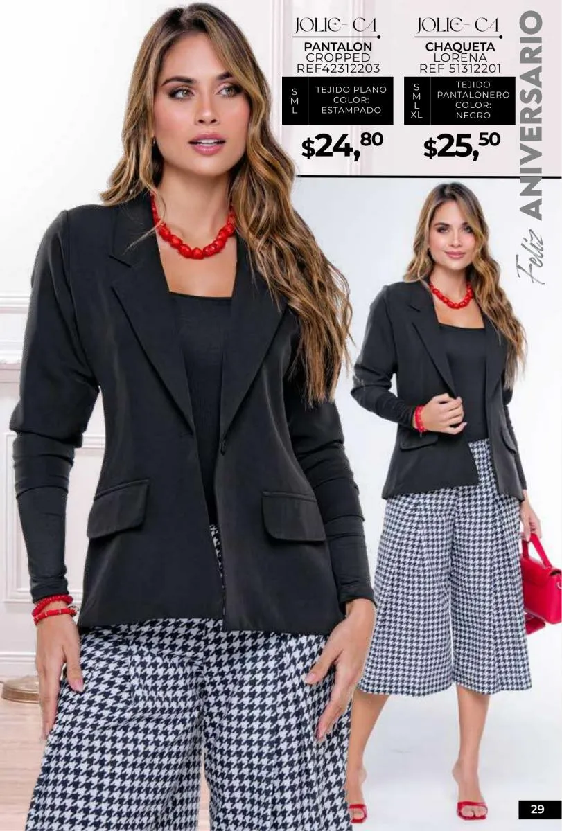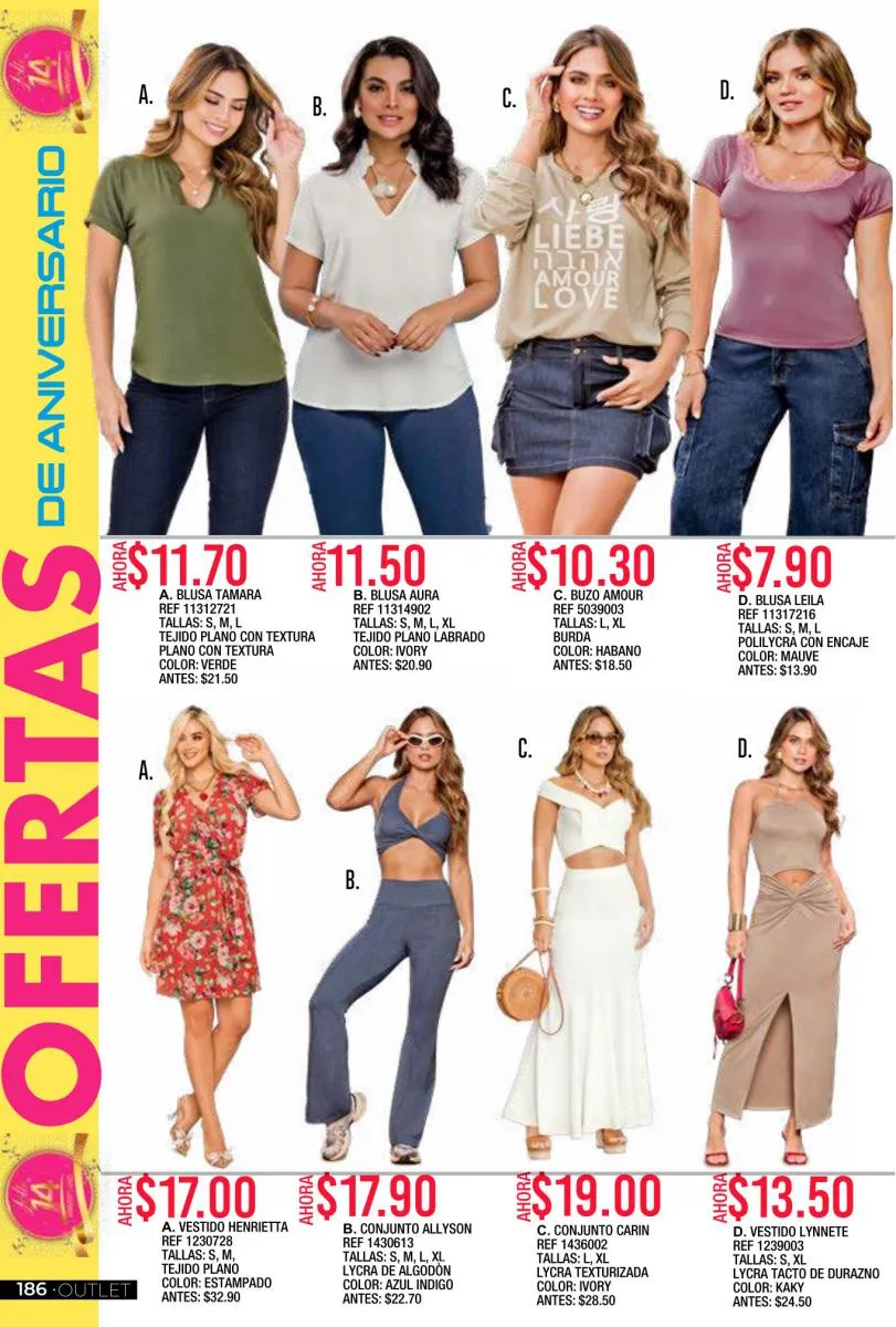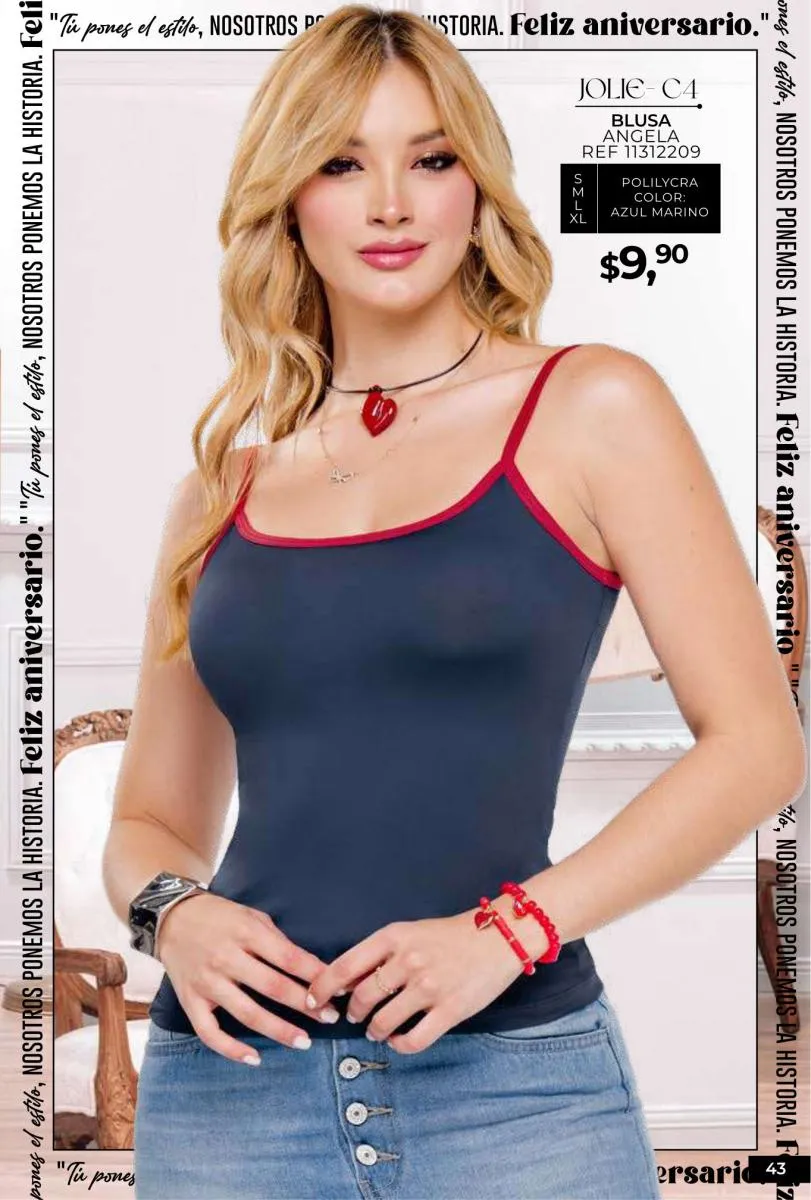 - Si de blusas se trata, hay una gran variedad en esta colección. Ejemplo de esto la de tono azul rey “Giselle”, elaborada en polilycra o la “Salmy” de manga larga y tejido plano (página 32).