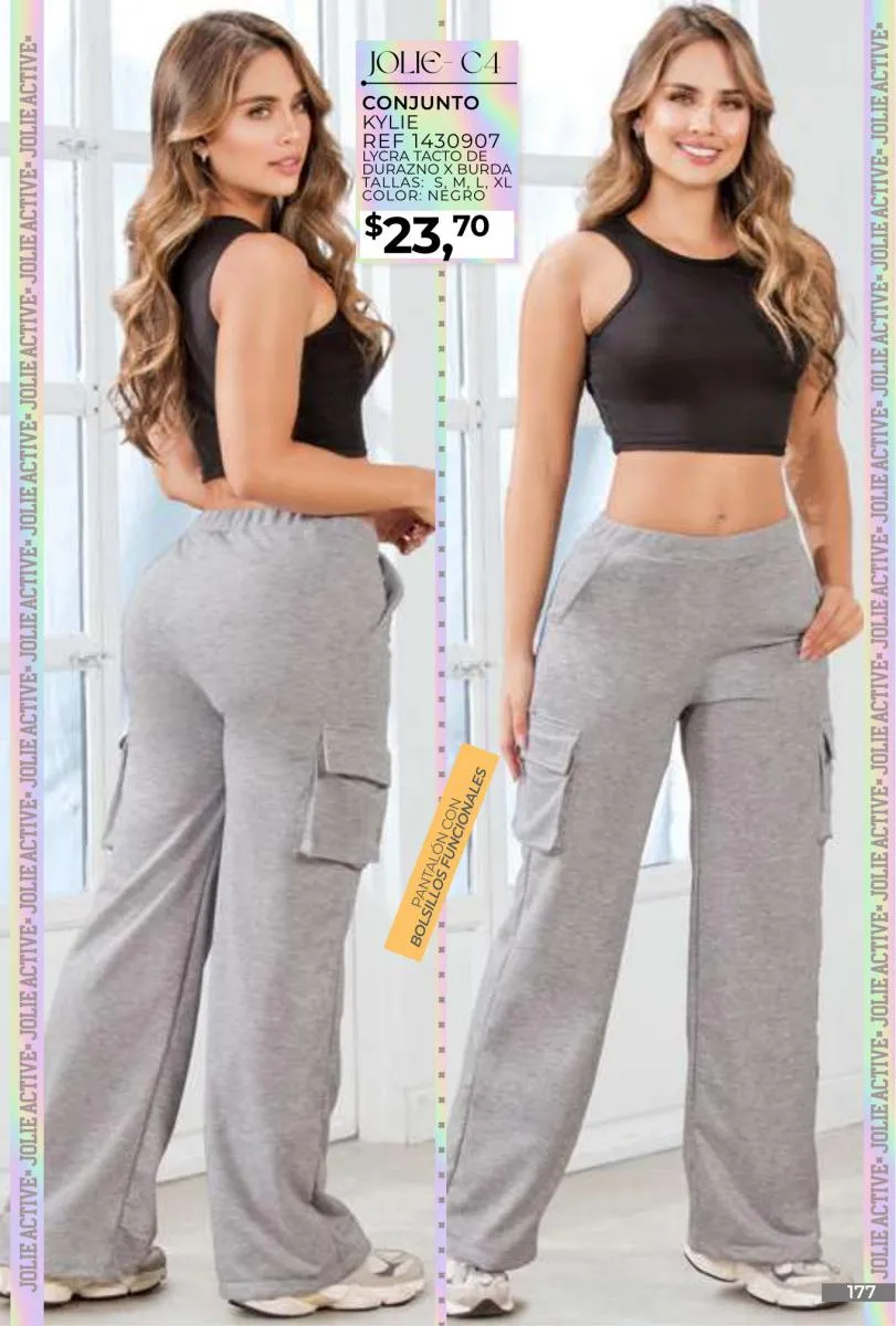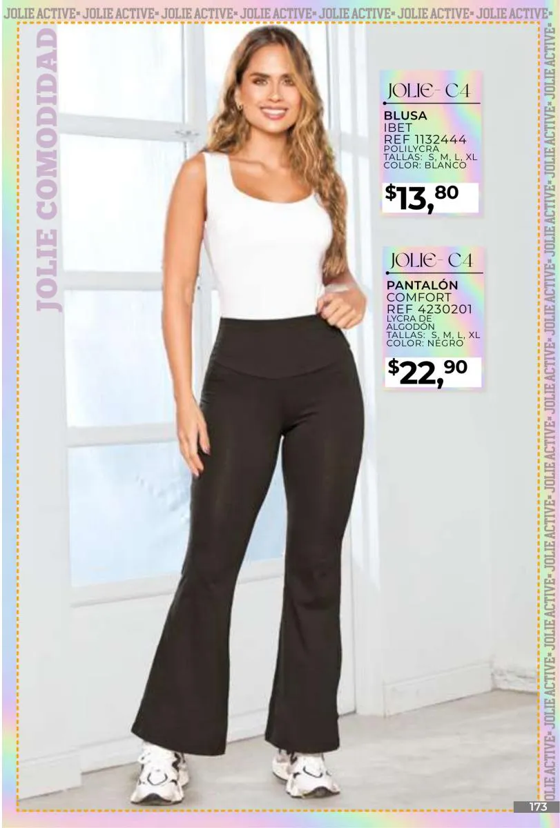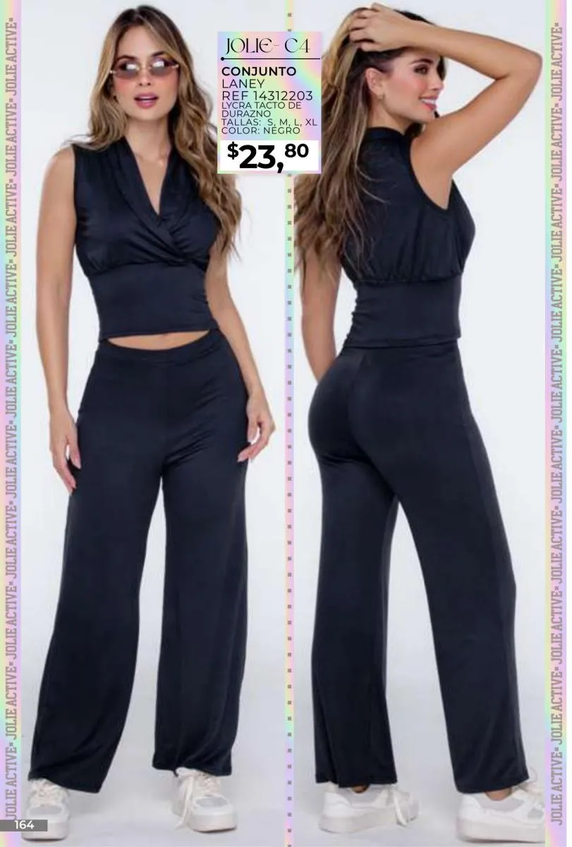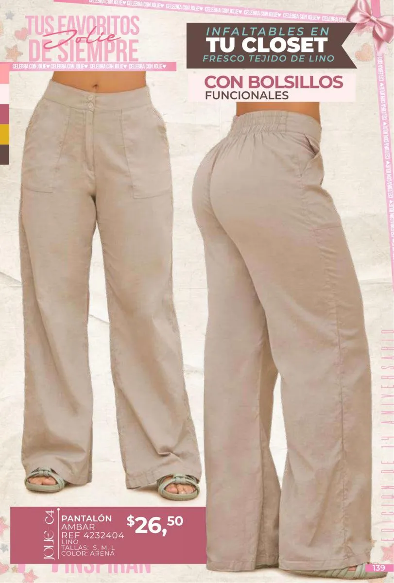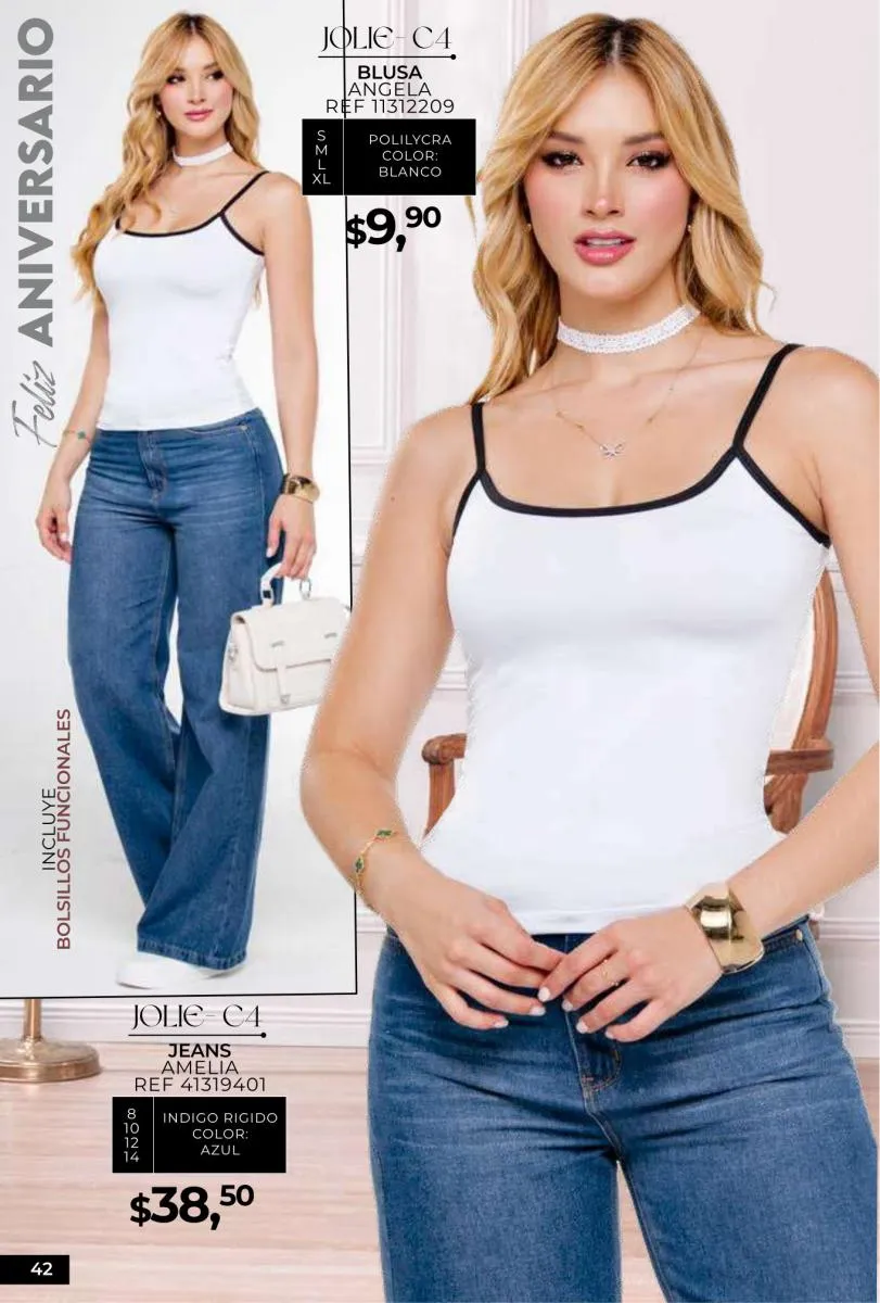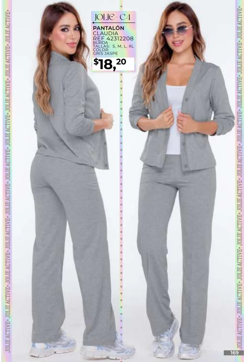 - Si de blusas se trata, hay una gran variedad en esta colección. Ejemplo de esto la de tono azul rey “Giselle”, elaborada en polilycra o la “Salmy” de manga larga y tejido plano (página 32).
