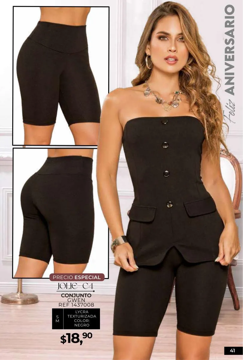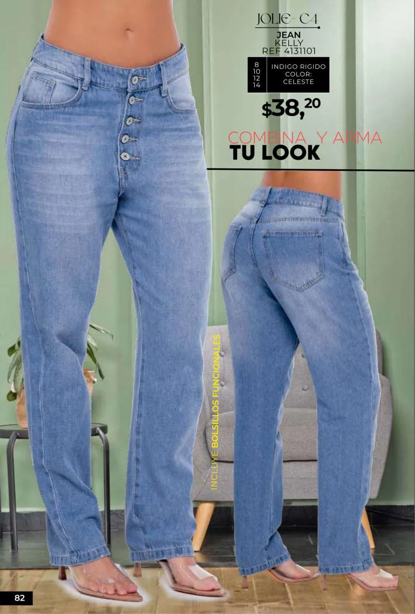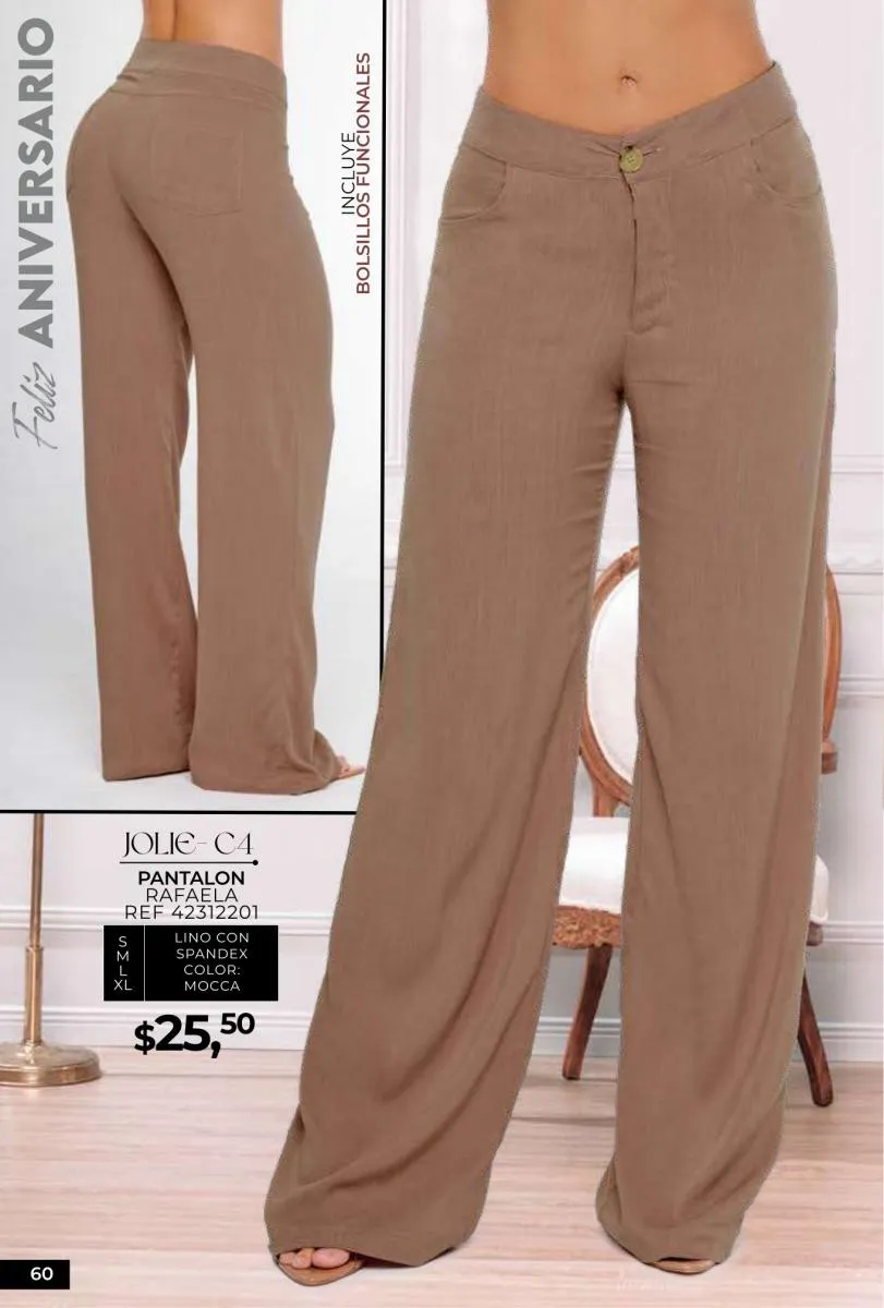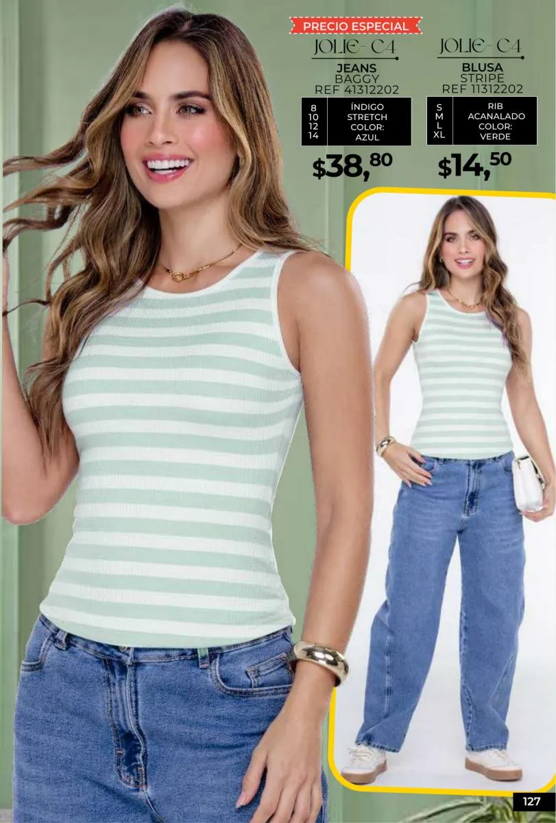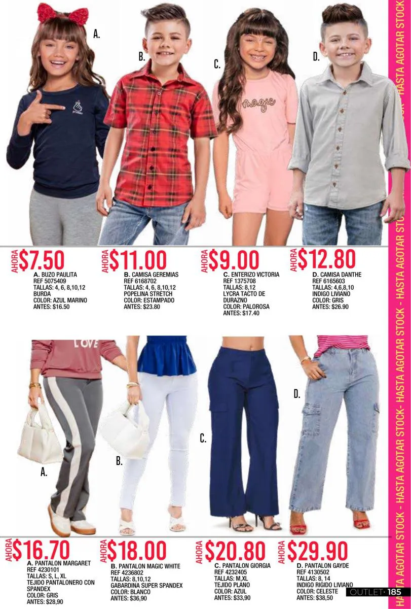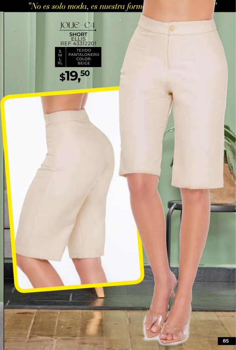 - Si de blusas se trata, hay una gran variedad en esta colección. Ejemplo de esto la de tono azul rey “Giselle”, elaborada en polilycra o la “Salmy” de manga larga y tejido plano (página 32).