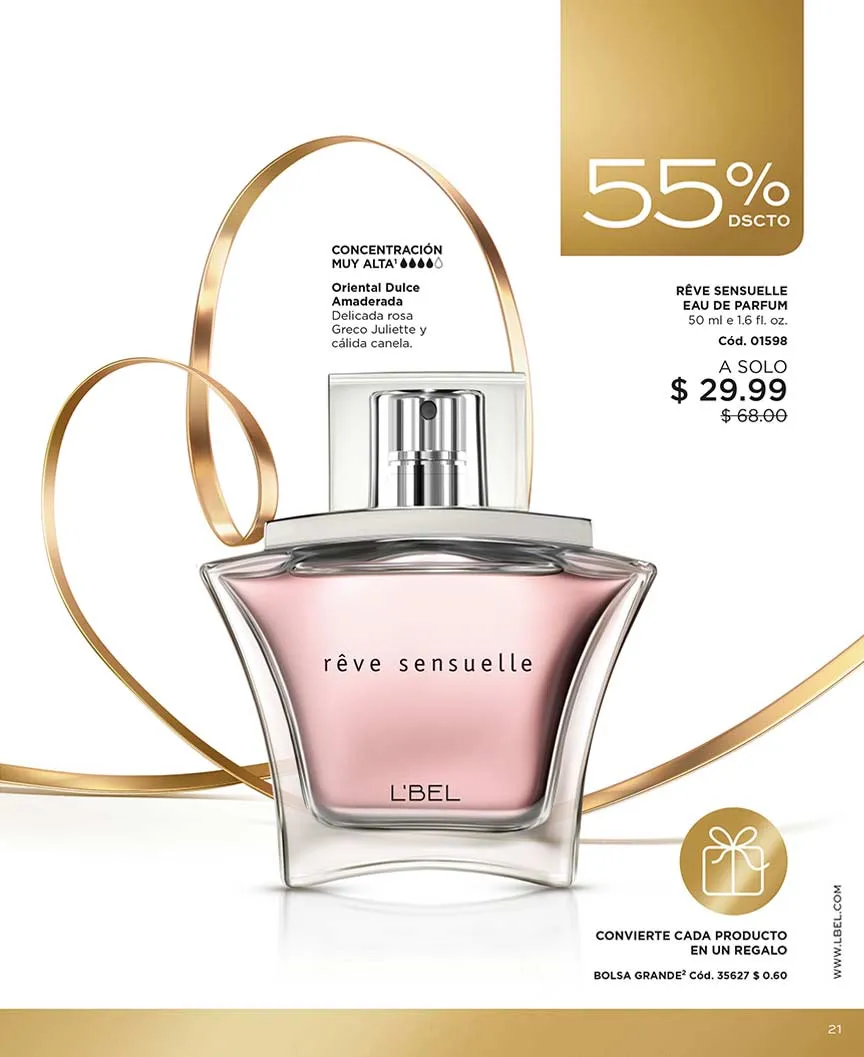 - Eau de parfum Rêve Sensuelle de 50ml fragancia oriental dulce: rosa Greco Jueliette, canela dulce de concentración alta. Por la compra de esta fragancia te llevas gratis: