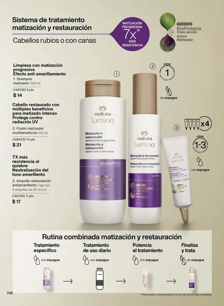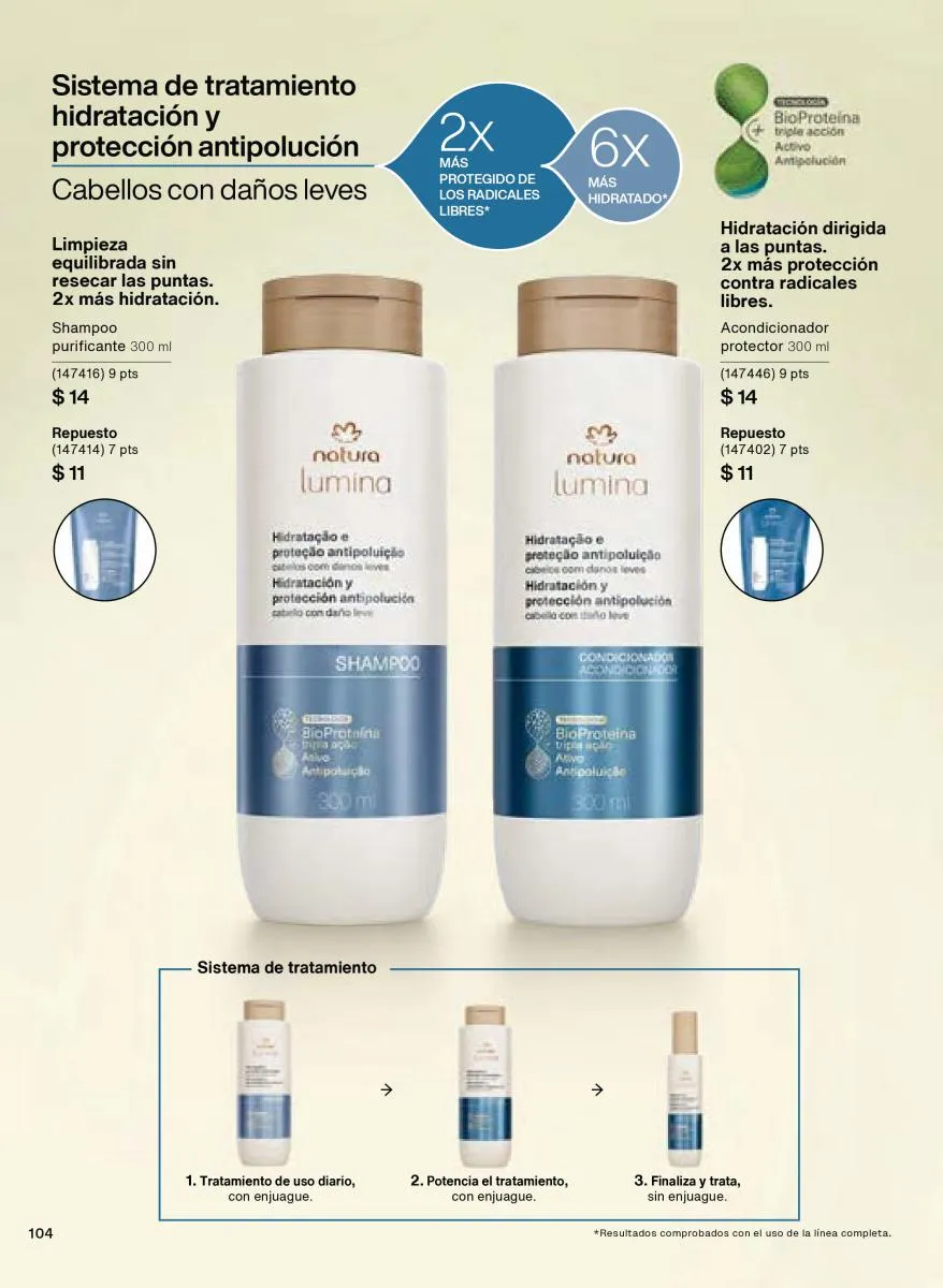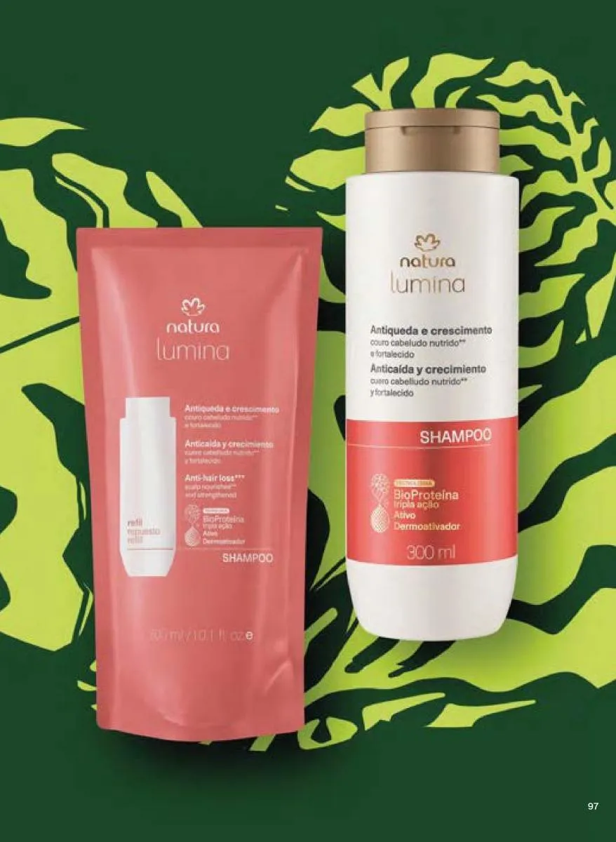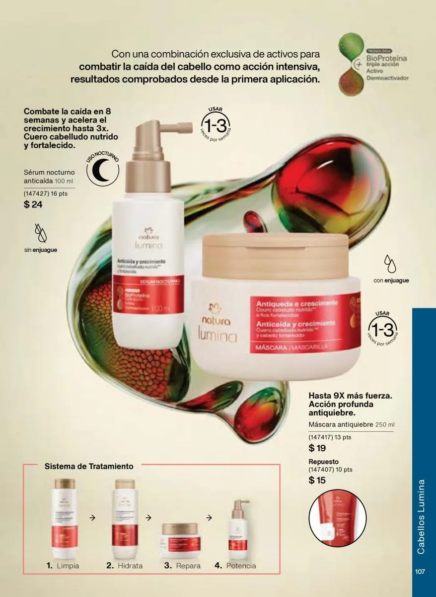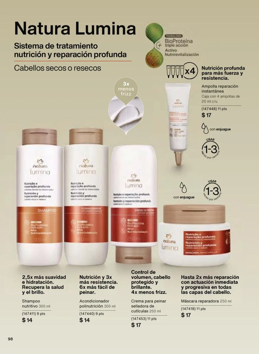 En cuanto al cuidado capilar, Natura Lumina propone un tratamiento pro-reconstructor pensado para cabellos dañados químicamente. La mascarilla y el concentrado reparador trabajan en conjunto para devolver la fuerza, el brillo y la vitalidad a la fibra capilar desde la raíz hasta las puntas, utilizando la exclusiva tecnología BioProteína.