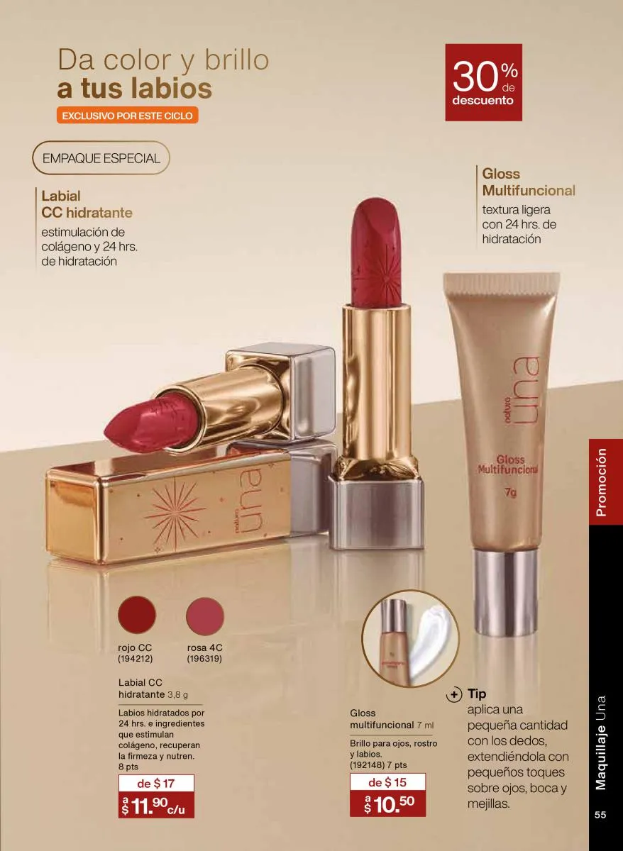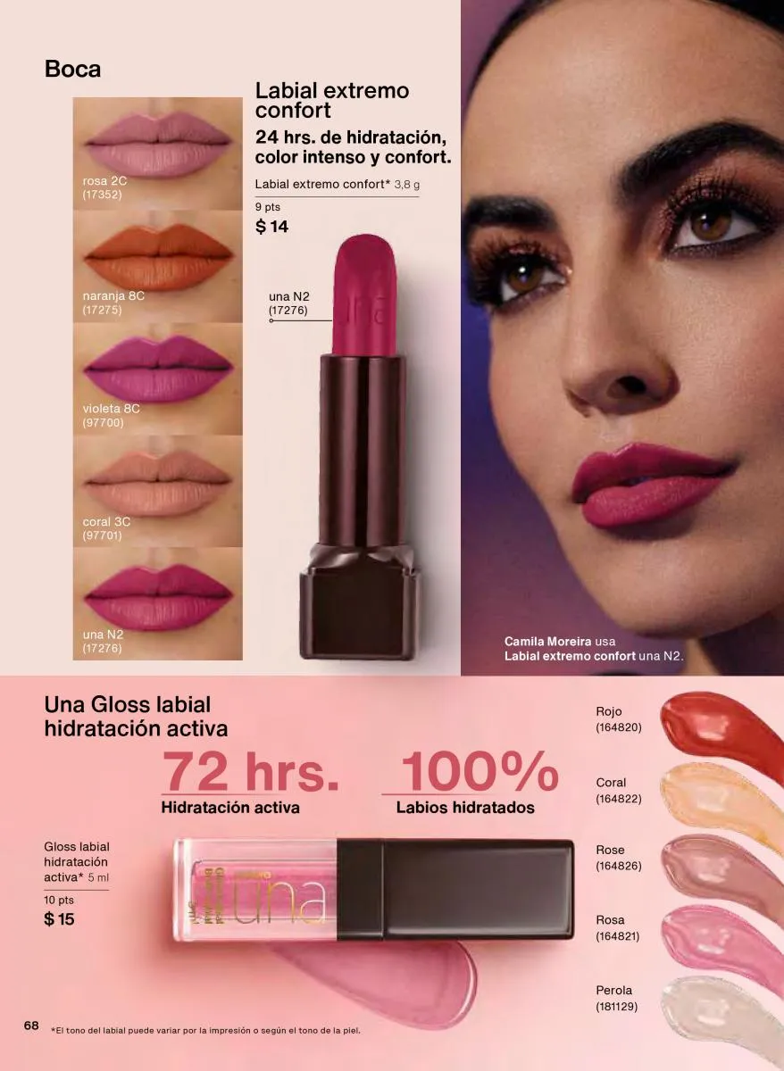 En esta campaña, Natura presenta una gama excepcional de labiales para todos los gustos. El labial extremo confort ofrece 24 horas de hidratación y un acabado intenso, ideal para quienes buscan una sensación suave y colores vibrantes. Los tonos como rosa, naranja, coral y violeta se adaptan a diferentes estilos y tonos de piel, brindando luminosidad y personalidad. Además, gracias a la Vitamina E y la tecnología de partículas con FPS 25, tus labios no solo se verán bien, sino que también estarán protegidos.