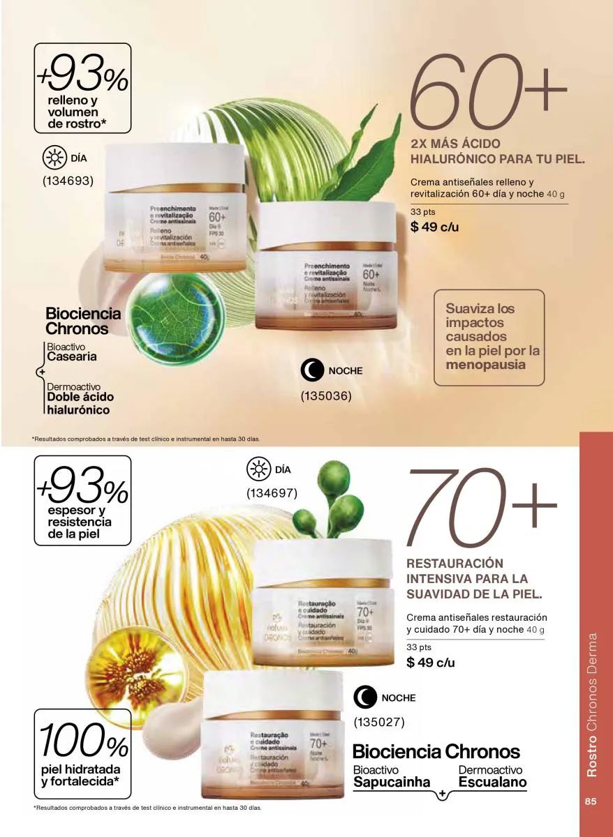 A esto se suman las opciones clásicas como las cremas antiséñales de Chronos, adaptadas a diferentes rangos de edad (30+, 45+, 60+ y más), todas ellas enriquecidas con activos clínicamente comprobados para combatir los signos del envejecimiento desde las primeras líneas hasta las arrugas profundas.