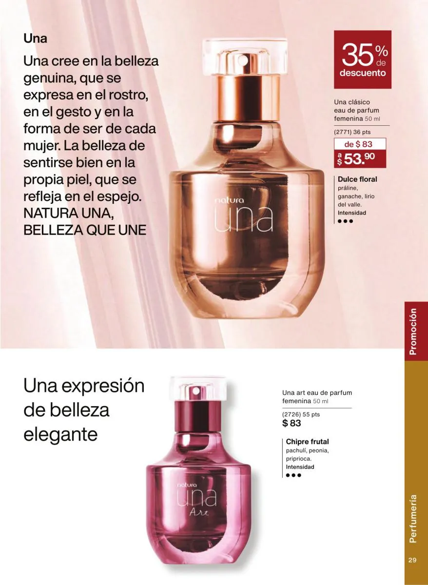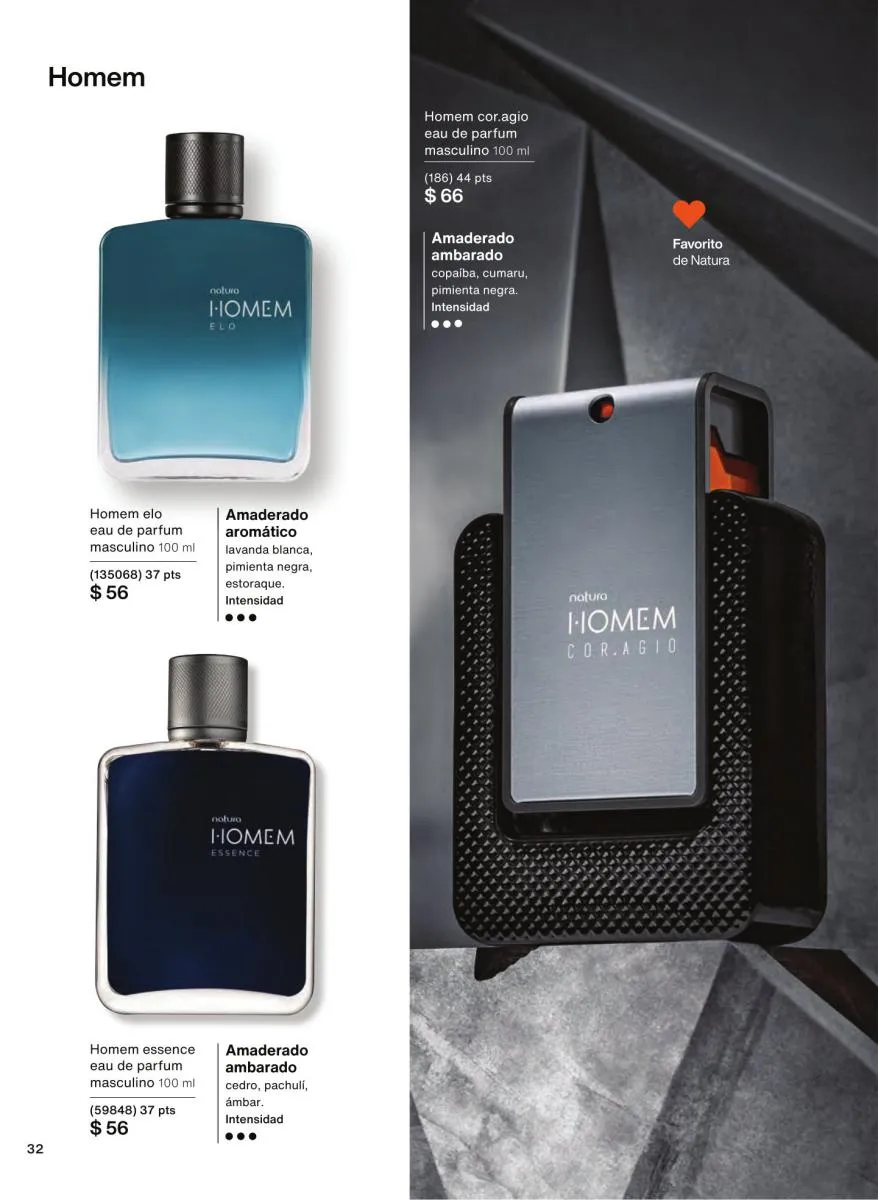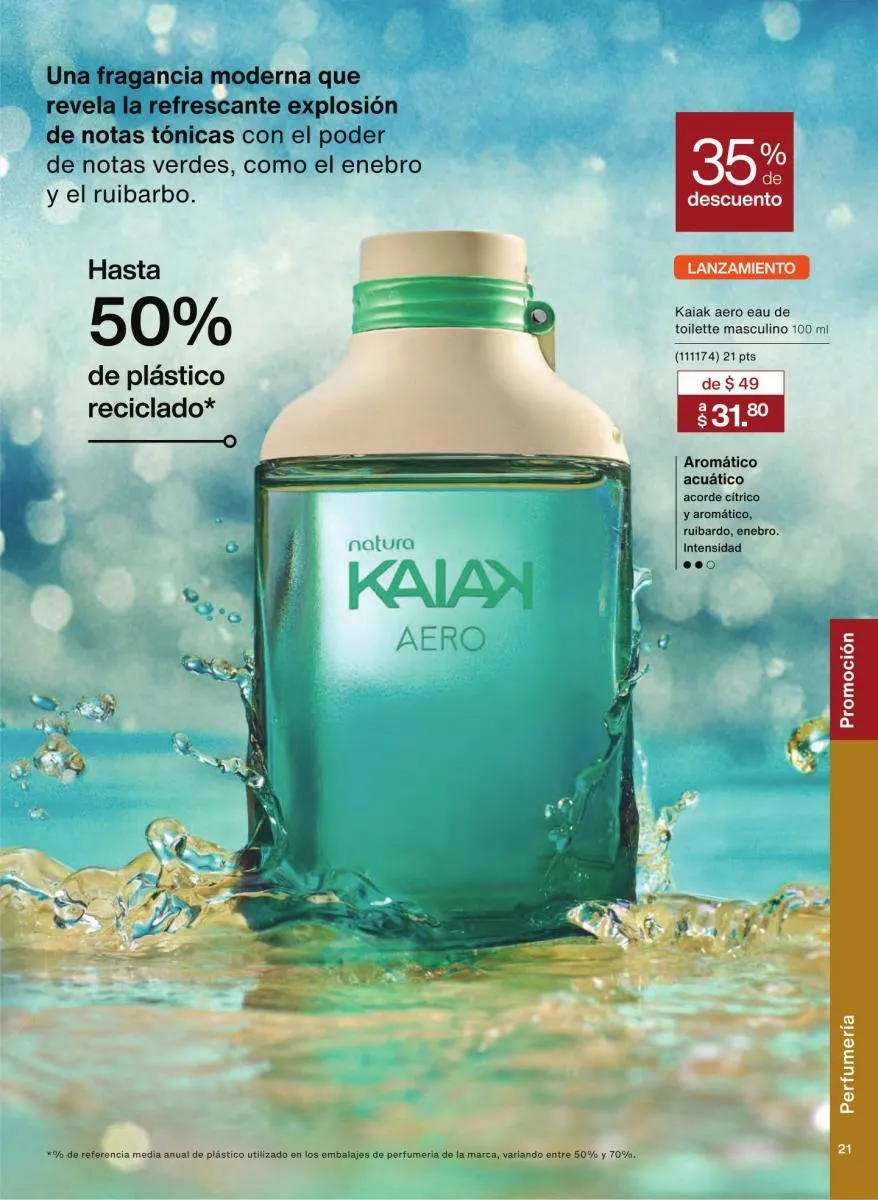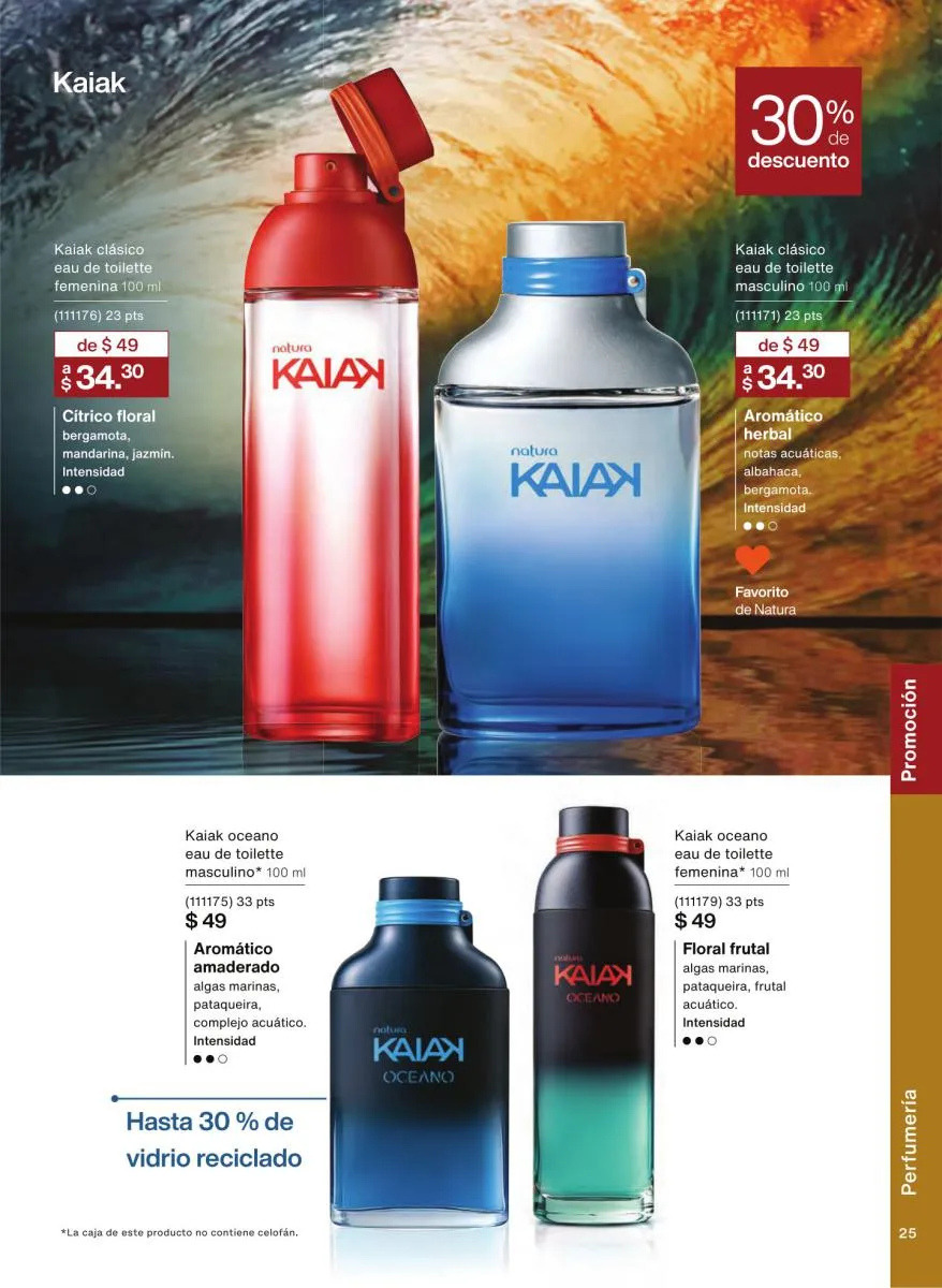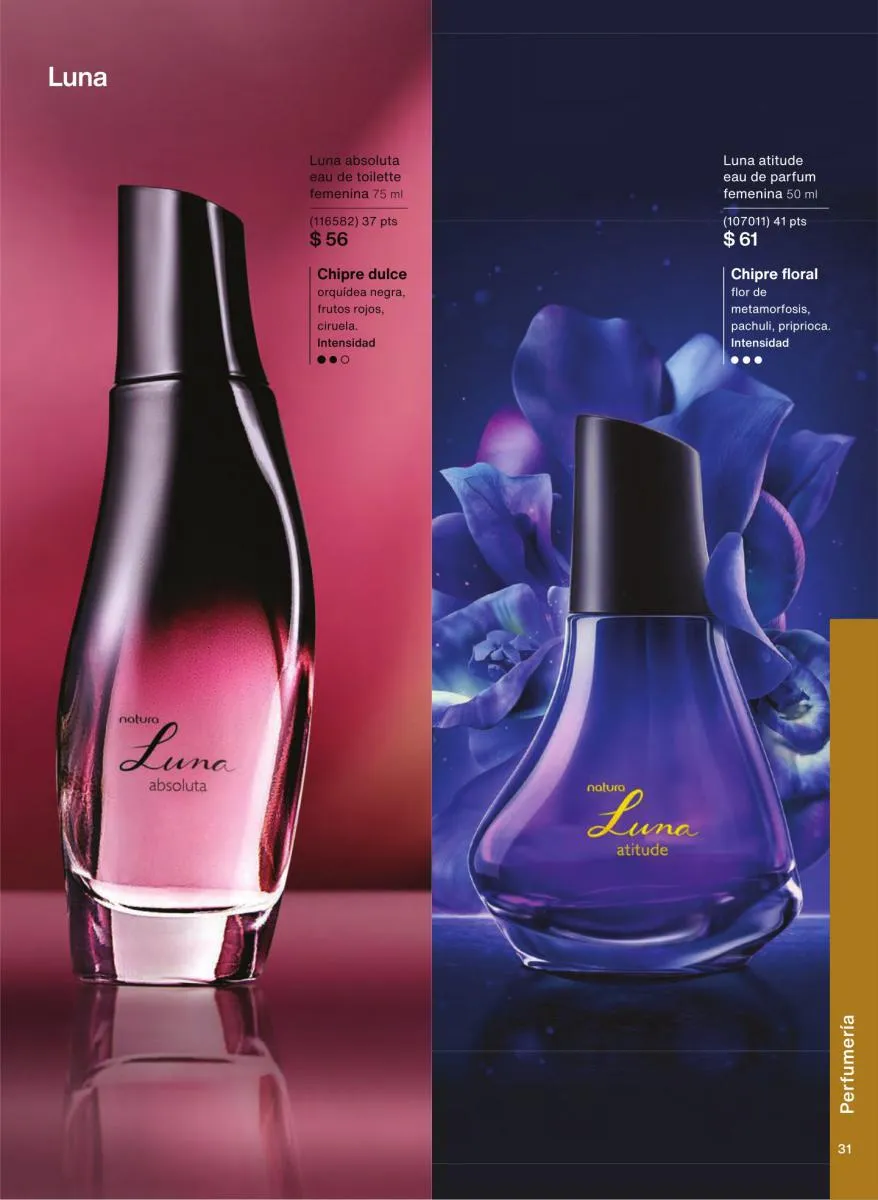 Las fragancias en este catálogo no solo se diferencian por su intensidad o notas aromáticas, sino también por su mensaje. Desde esencias inspiradas en la sensualidad femenina hasta propuestas masculinas con fuerza y carácter, cada botella cuenta una historia única. Además, los envases reciclables, el uso de alcohol orgánico y el diseño intuitivo de los frascos refuerzan el compromiso de Natura con el medioambiente y la innovación responsable.