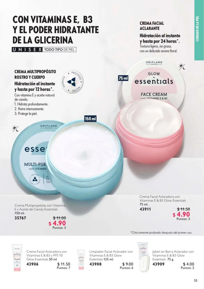 - El descuento especial del mes del jabón en barra y la crema facial aclarante Glow Essentials.