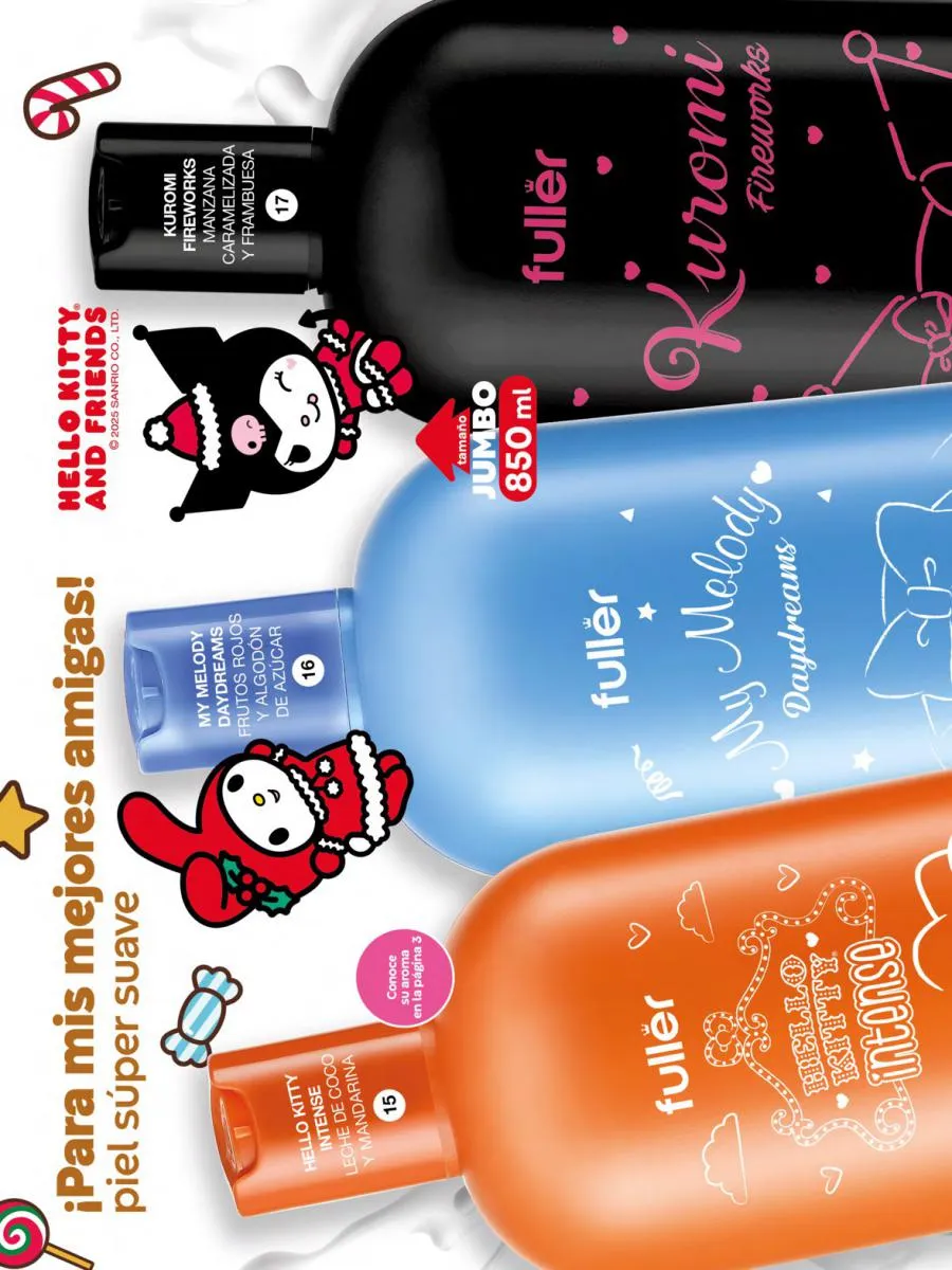 Este mes se destaca la nueva incorporación Frosted Coconut, perfecta para esta temporada de fiestas navideñas. Y, como Fulller sabe que amás probar todo lo de Hello Kitty no deja de lado su colonia original y la edición especial Gold.