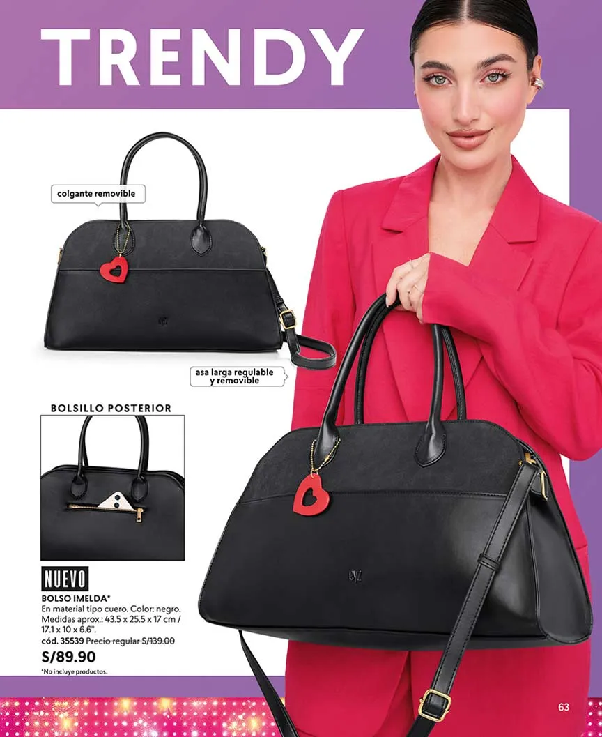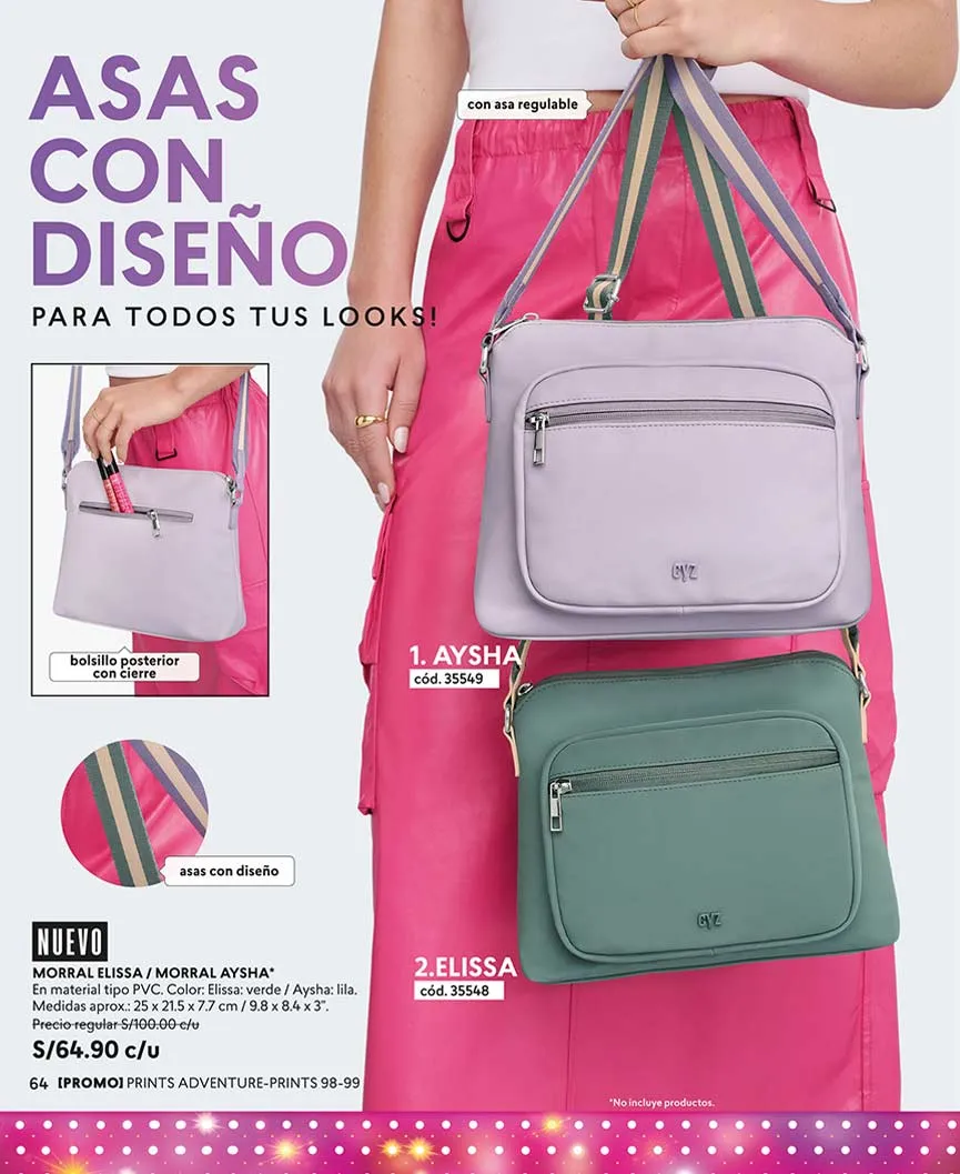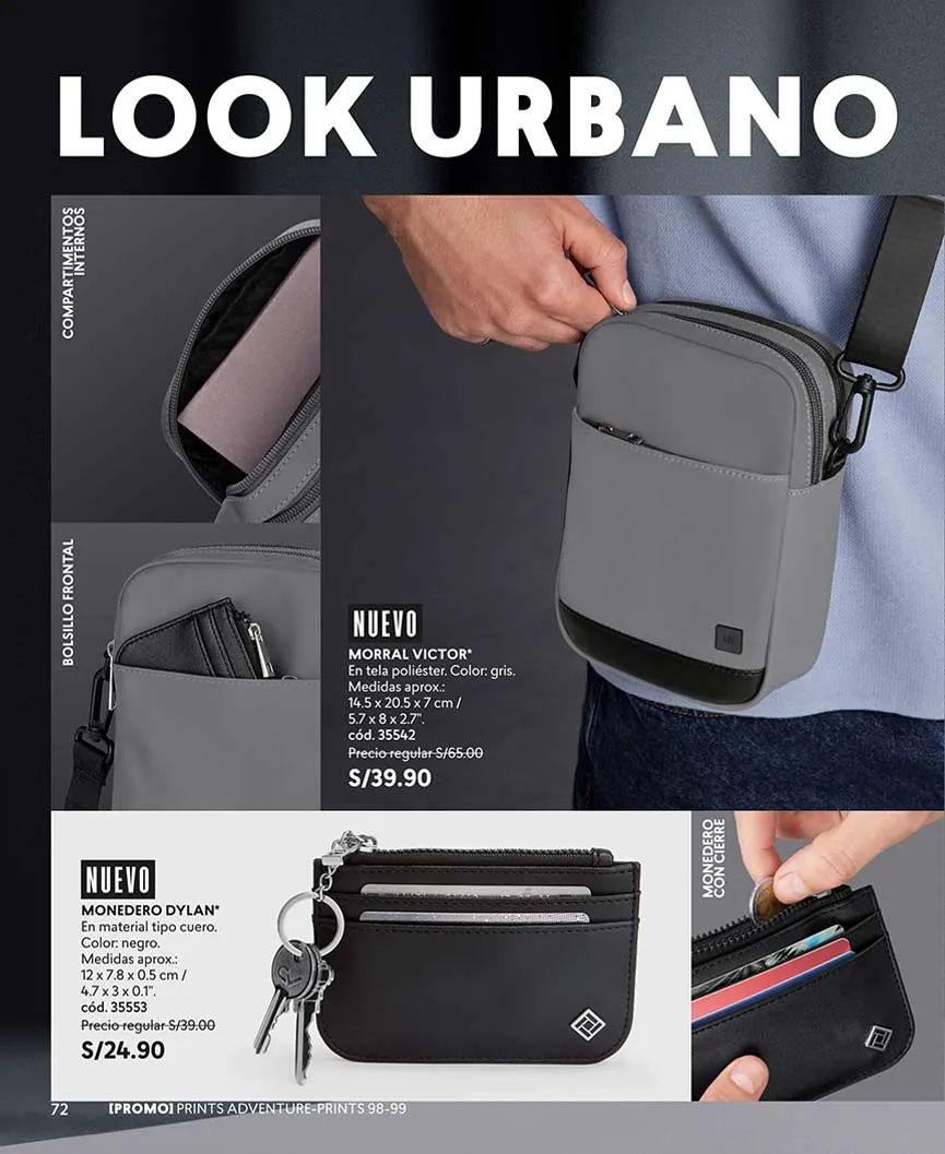 • Si te gusta el estilo casual esto es lo ideal para tu día a día: Morral Almendras con múltiples bolsillos y colgante Trendy removible incorporado. Elaborado en tela poliéster, Medidas aprox 32 x 26 x 8 cm. Pag 27.