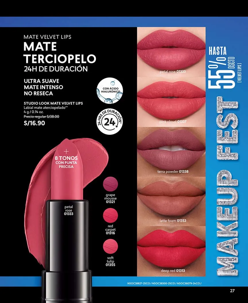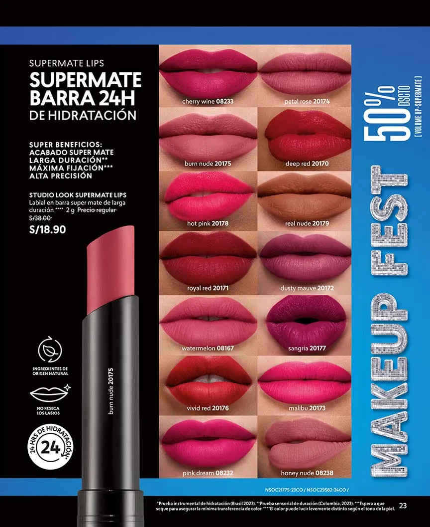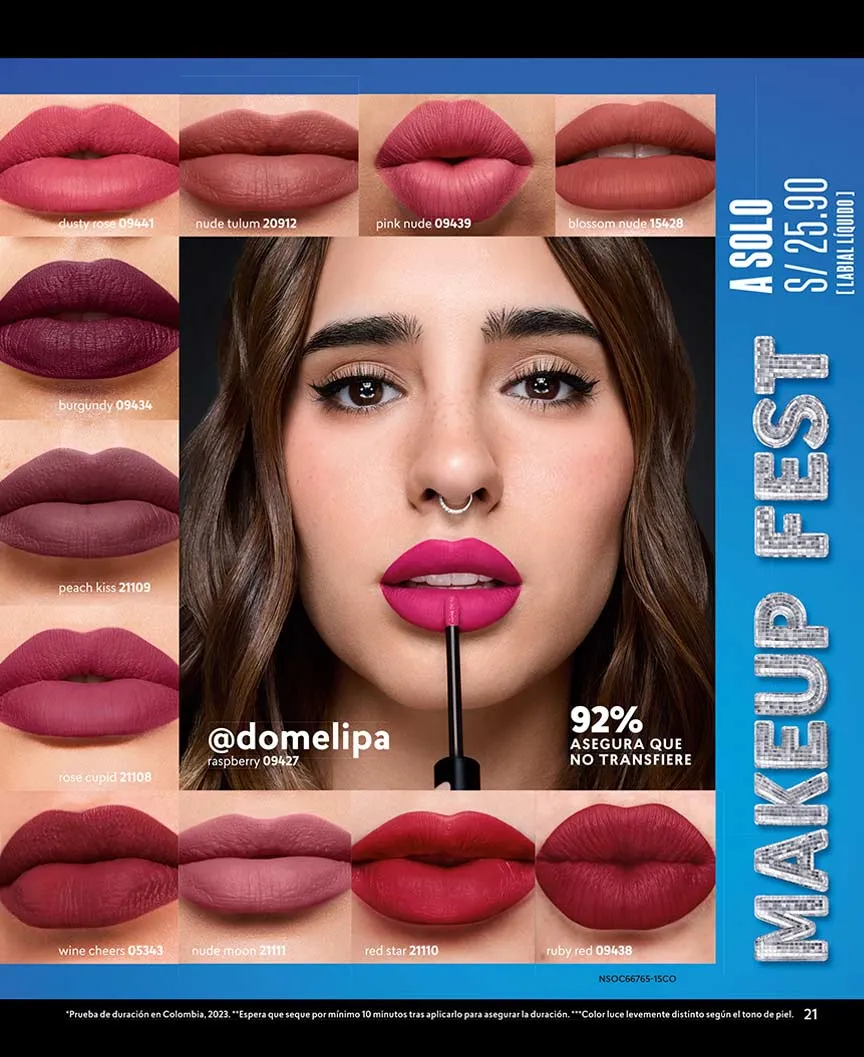 - Si deseas un efecto mate y una textura agradable en tus labios el labial líquido te brinda tus colores favoritos cada vez más intensos, los cuales serán tu mejor opción para recrear infinidad de Makeup, no es transferible y te garantiza un duración de hasta 16 horas, 6 ml. Pag 7.