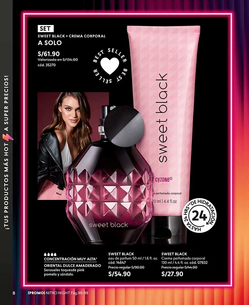 - Se única, se sensual con toques de Pink pomelo y sándalo presentes en el Sweet Black en Eau de parfum, 50 ml. Pag 69.
