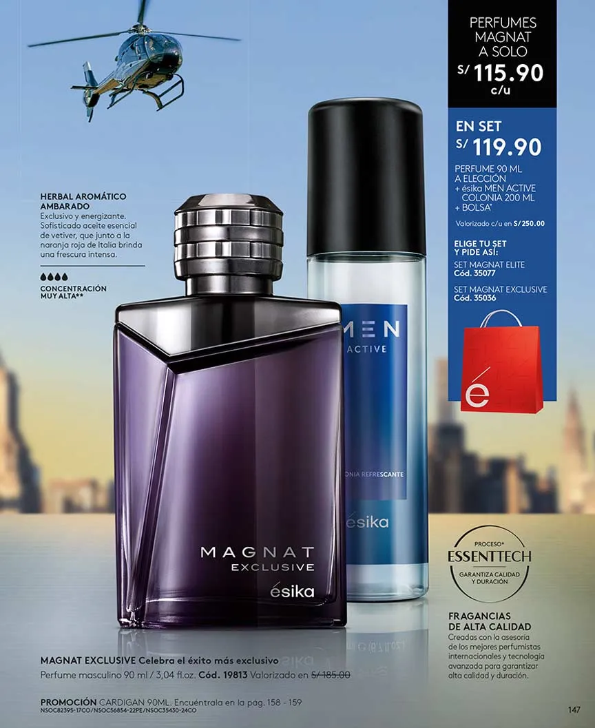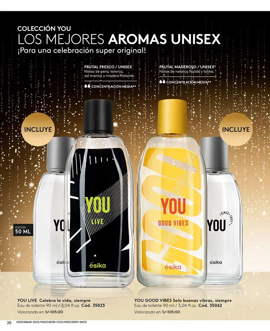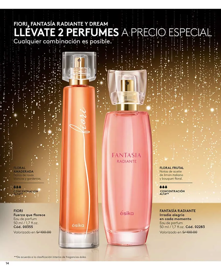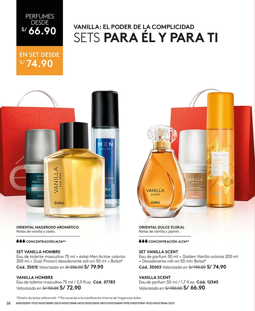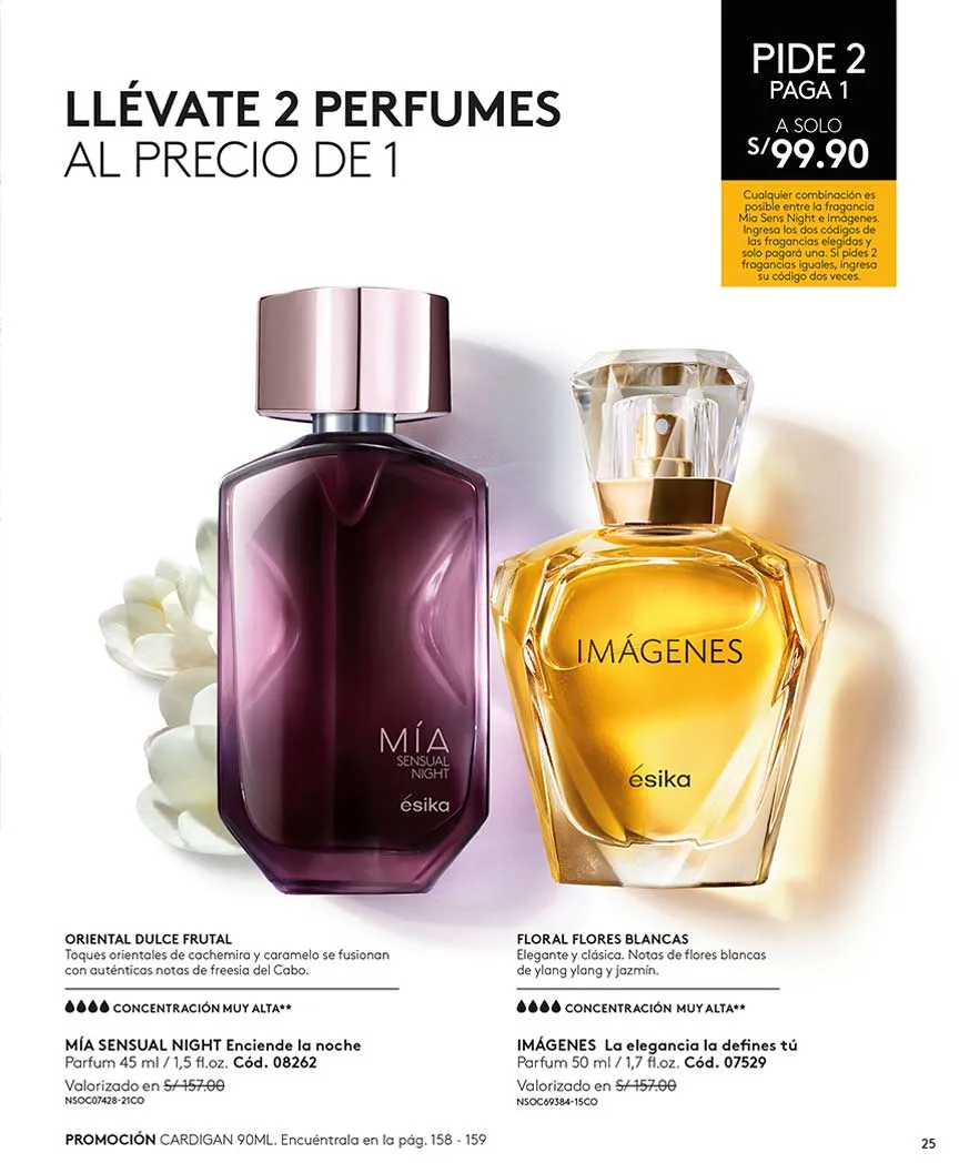 • Se tu misma con el nuevo Set Mia Ésika con aroma floral: Fascinantes notas de gardenia dorada de áfrica y pimiento rosa con alta concentración Parfum de 45ml + Loción Perfumada 150ml + Mía Parfum 7,5ml + Vibranza Blanc Probador con Spray 2ml. Pag 10.