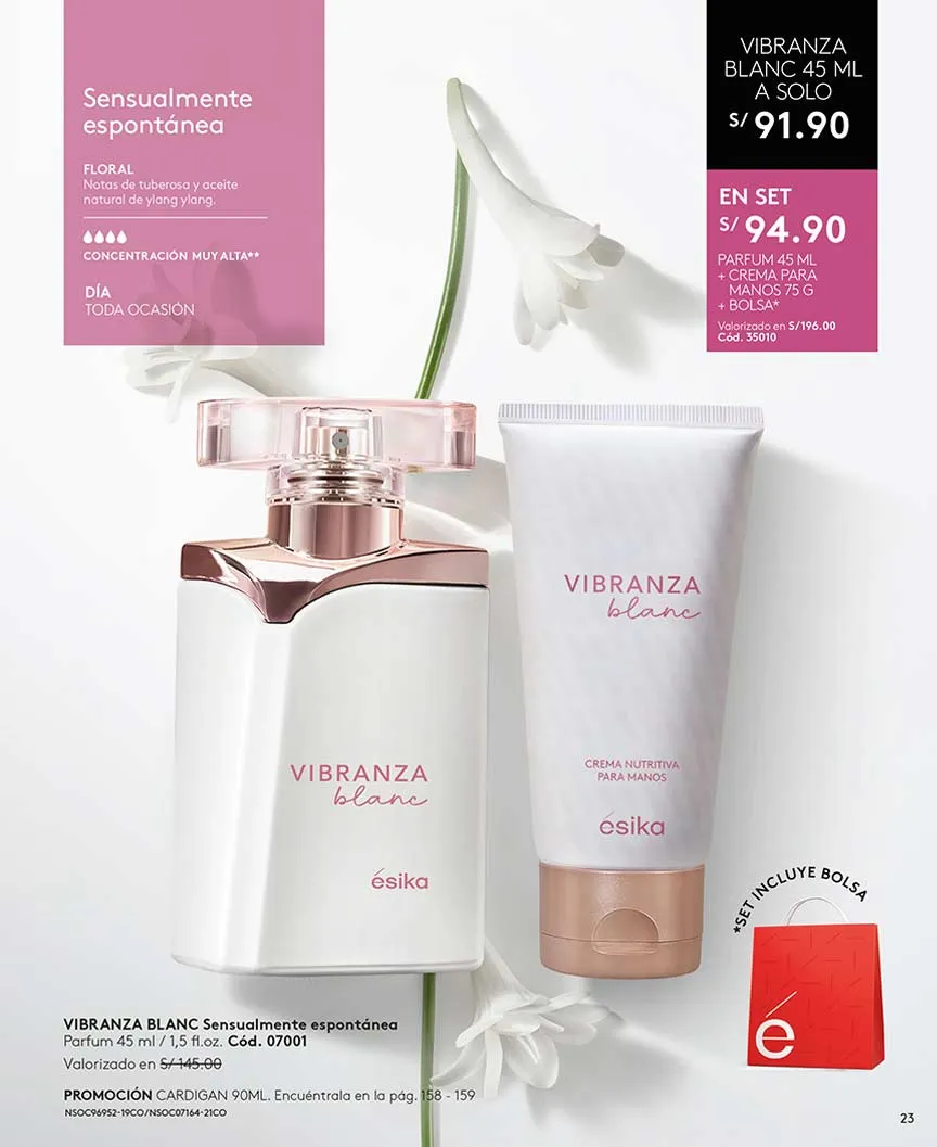 • Vibra alto con Vibranza Blanc Parfum 45ml, Aroma Floral: Vibrantes notas de tuberosa se unen al exclusivo aceite natural de ylang-ylang. Pag 9.