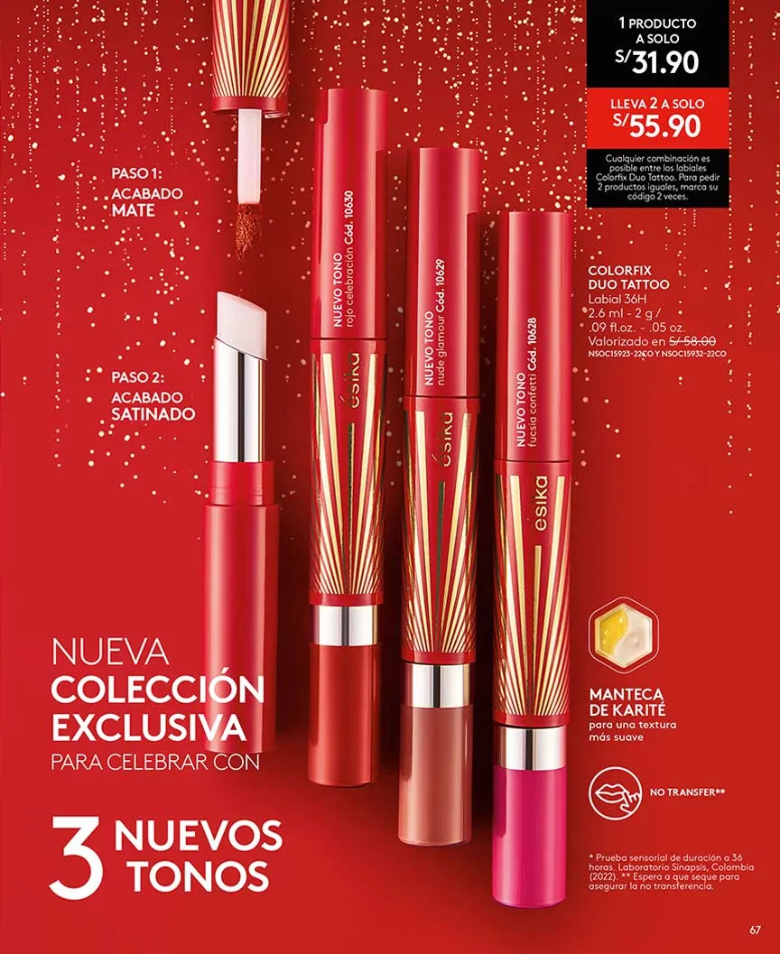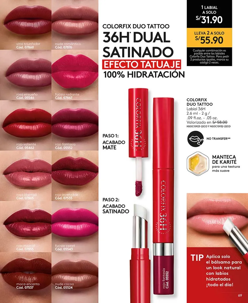 • Pon a prueba 24 horas de color que no transfiere con Colorfix Dúo Tattoo, Labial 24 horas 2,6ml. Pag 31.