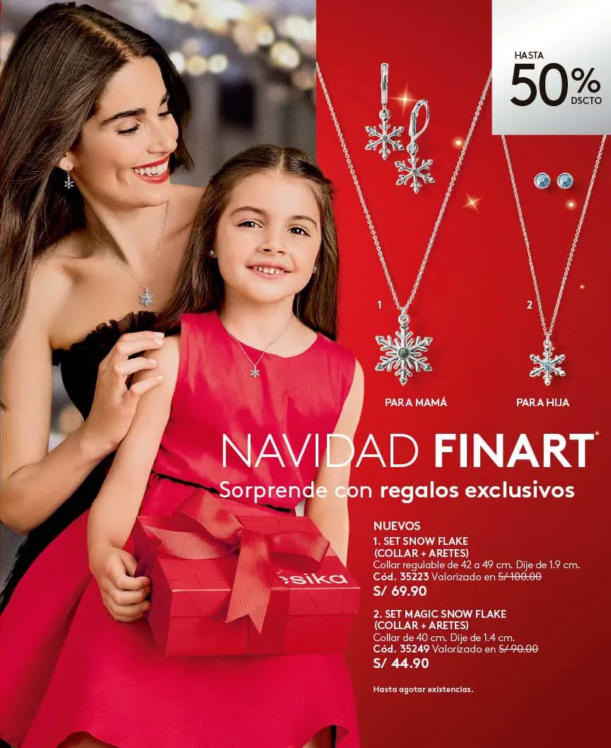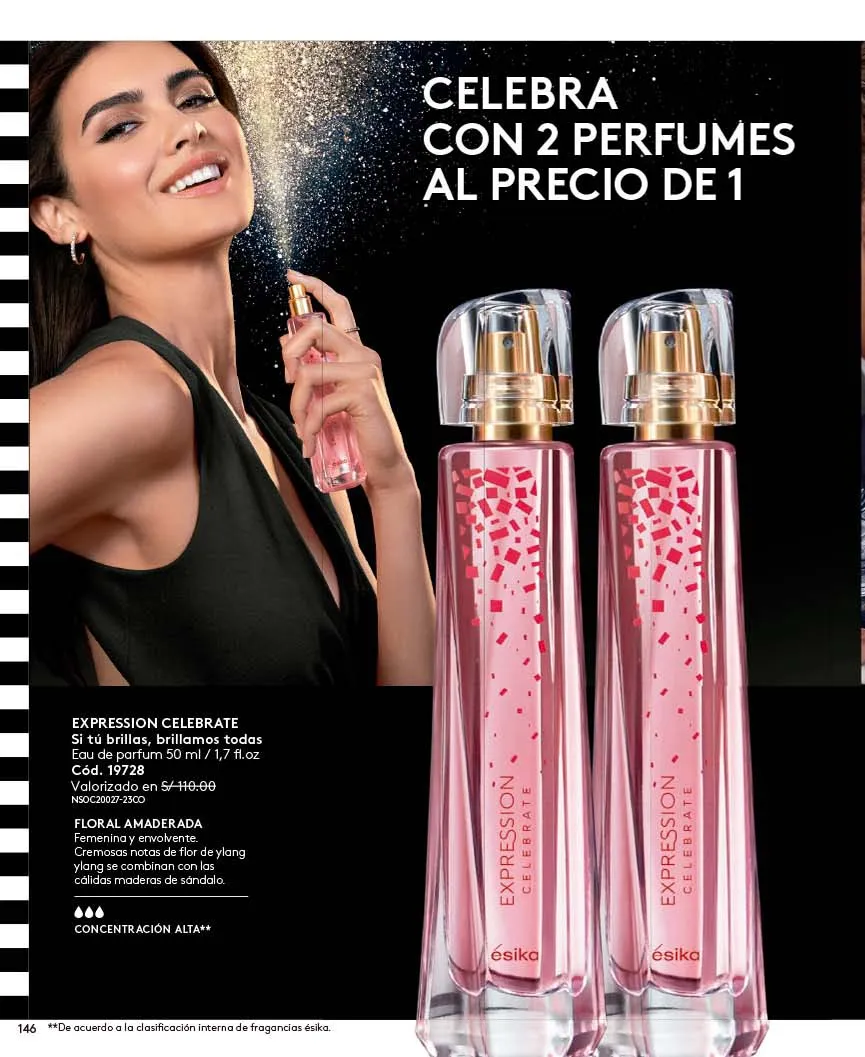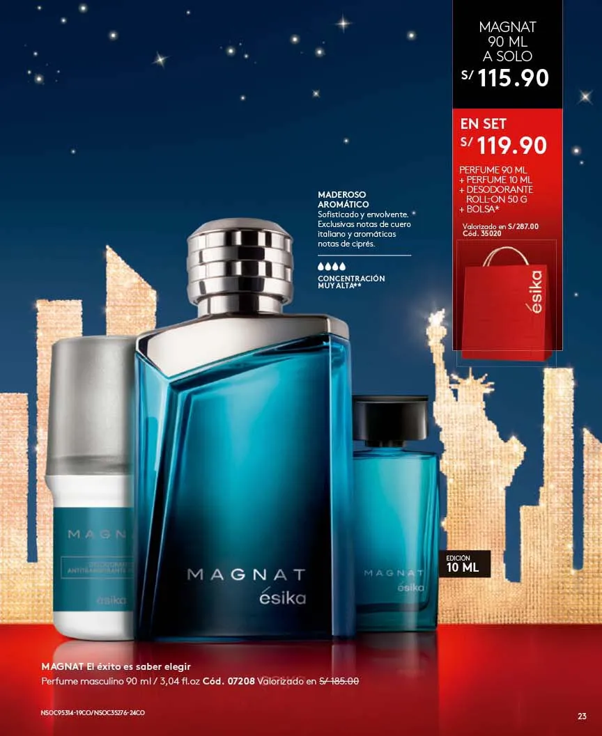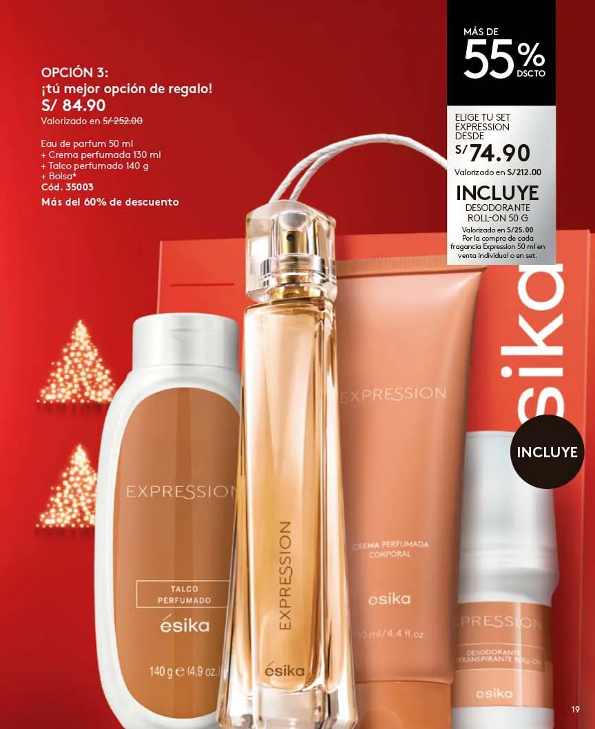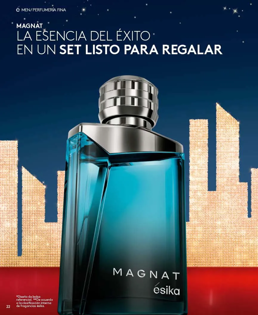 - El regalo que todas queremos para navidad lo tiene Ésika y es el exclusivo Set Imágenes Ésika, Incluye Perfume 50ml Con aroma Floral: Elegante y clásica, Notas de flores blancas ylang-ylang y Jazmín + Loción perfumada 150ml + Talco Perfumado 140g + Bolsa. Pag.9.