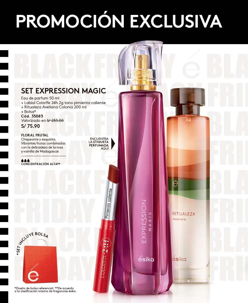 - Para consentirte a ti misma también te ofrecemos el nuevo Set MÍA Ésika Parfum 45ml con aroma Floral: Luminosa y exquisitas notas de gardenia dorada de áfrica y pimienta rosa + Mascara Mega Full Size APA Tono negro + Loción Perfumada 150ml + Bolsa.Pag.10.