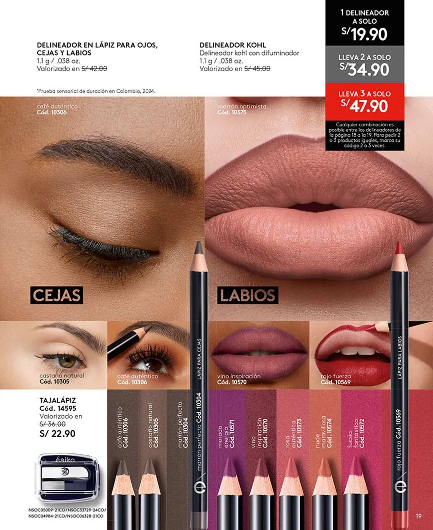 - Cejas Naturales con efecto de microblading con la increíble combinación de: Estuche 4 en 1 para ojos y cejas (Sombras para ojos y cejas, cera fijadora de cejas, delineador de ojos de 4,7g.) y Desmaquillador Bifásico (Desmaquillador Bifásico de maquillaje APA Para el rostro ojos y labios de 125ml). Pag 25.