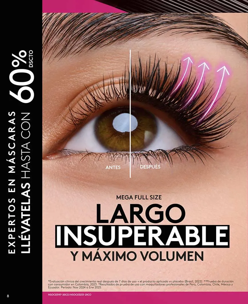 - Ten en tu mirada un volumen extremo y ausente de grumos con Mega Full Volume, Mascara efecto volumen a prueba de agua tono negro de 8g. Pag 14.