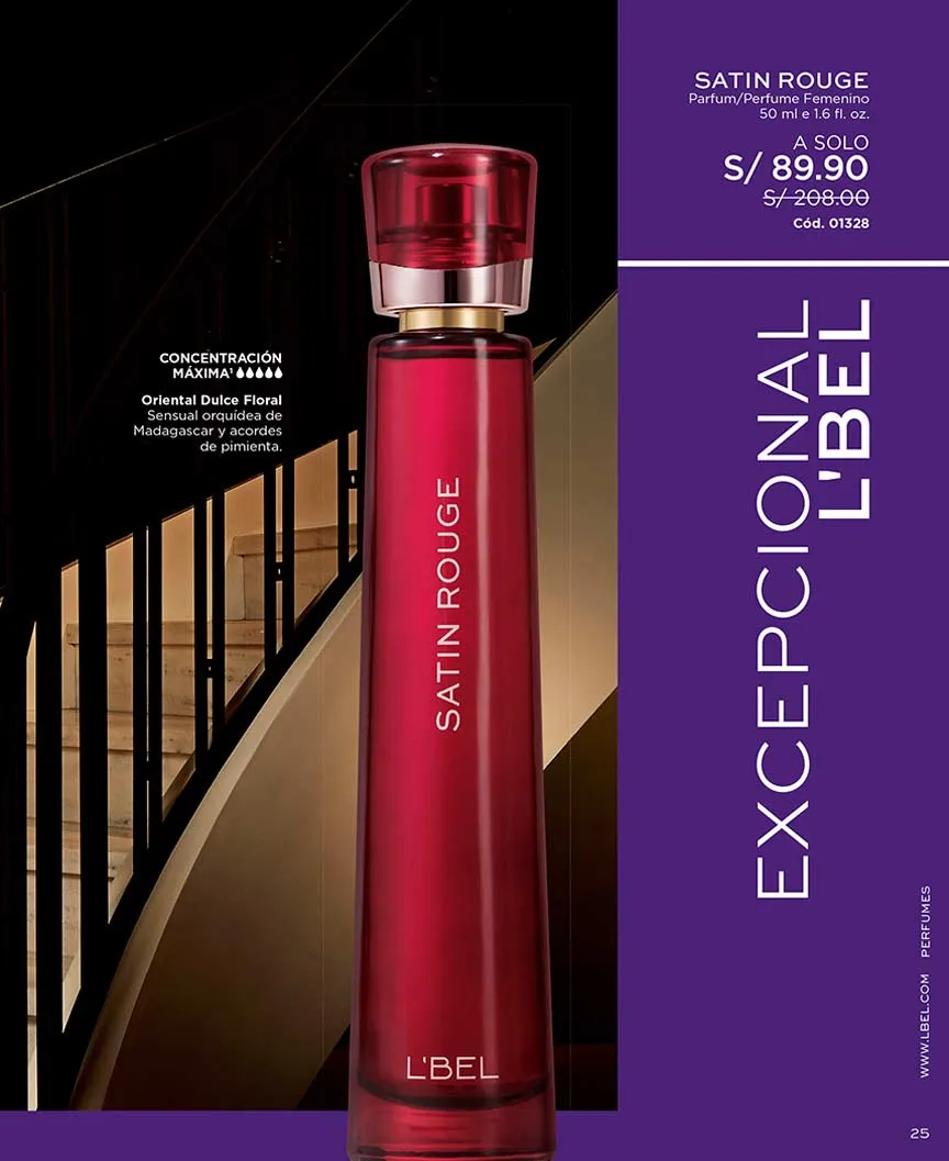 - Set Satin Rouge compuesto por: Satin Rouge Eau de Parfum de 50ml fragancia oriental dulce de intensidad alta + mini perfume de 10ml + loción perfumada de 100ml.