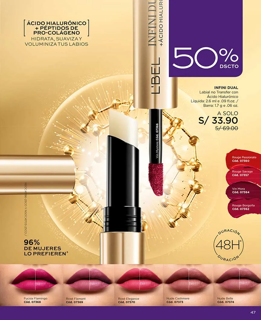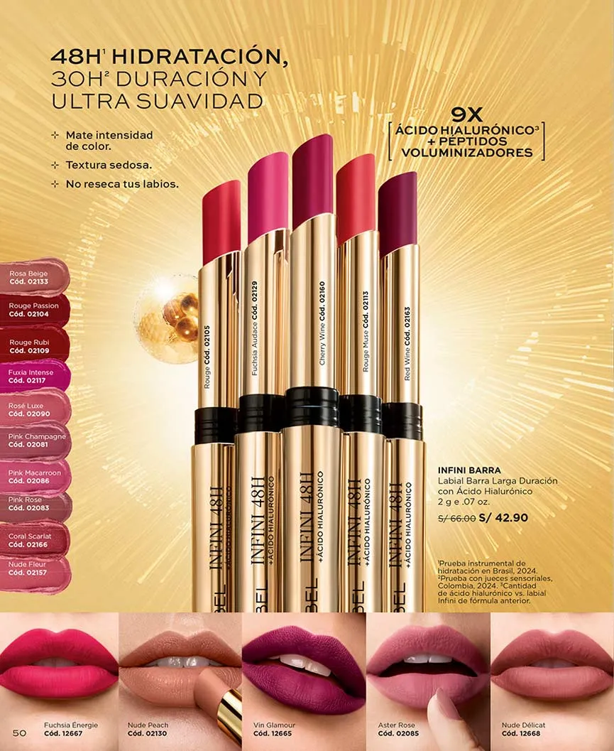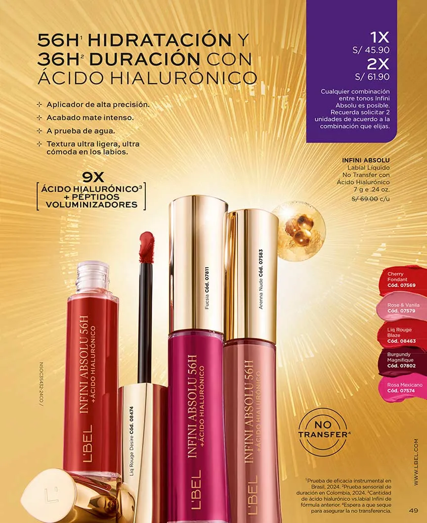 - Labial líquido Infini Absolu de 7g con ácido hialurónico, garantiza hasta 18 horas de duración y está disponible en 20 tonos con un 50% de descuento.