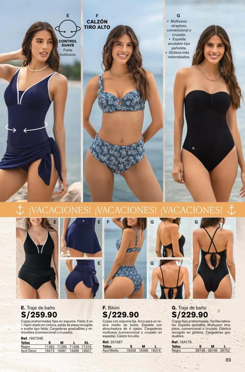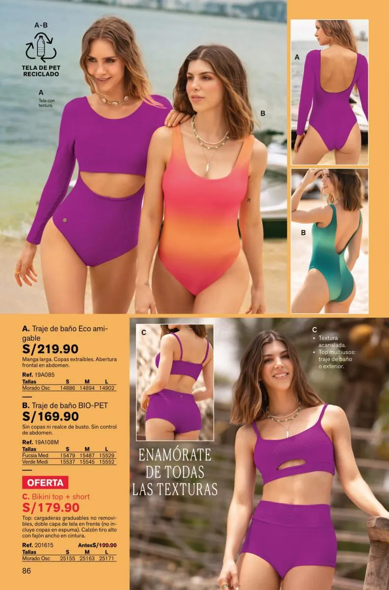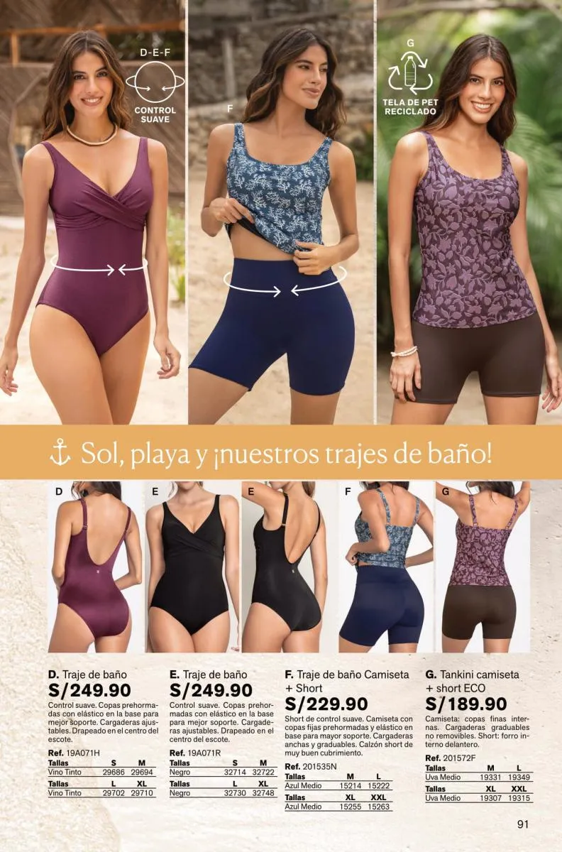 No podemos dejar por fuera de este resumen las piezas de traje de baño, especialmente las de la línea ECO, elaboradas con nylon reciclado. Pero hay más piezas en esta catálogo Leonisa 18 2025 Perú: trikini multiuso, trajes de baño control fuerte y los vestidos playeros más coquetos para este verano.
