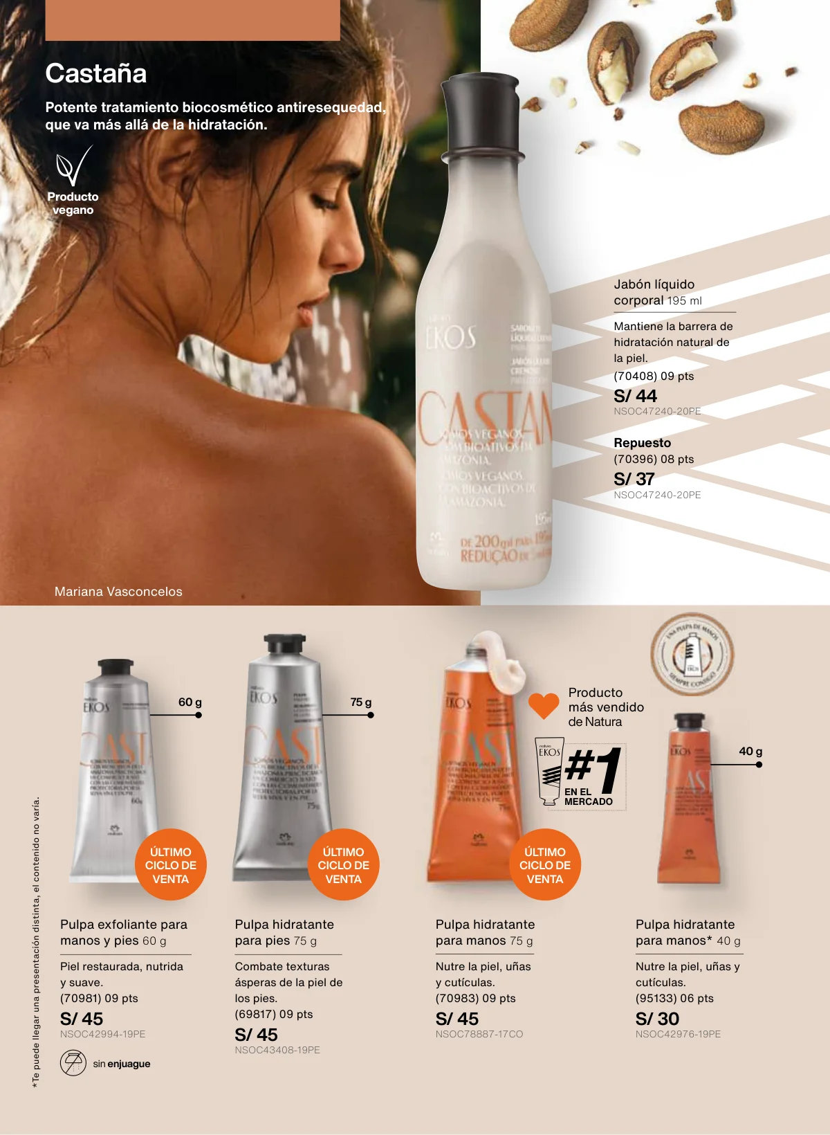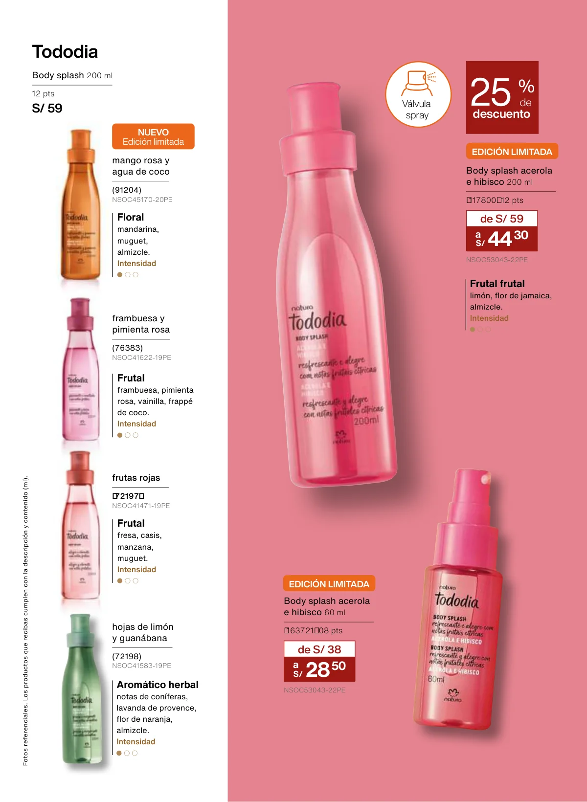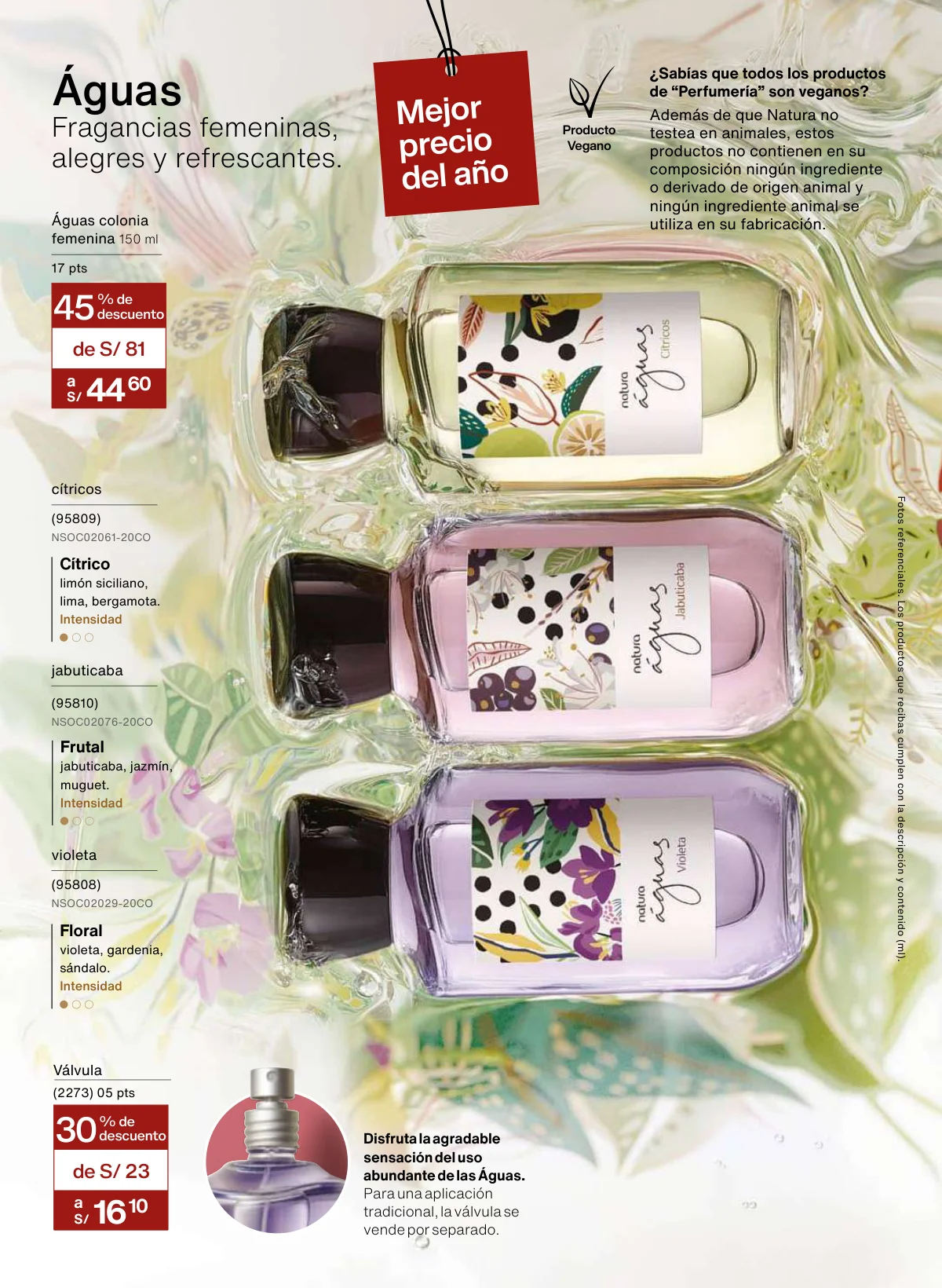 En la página 23 de este fabuloso catálogo podemos conocer la nueva propuesta que Aguas incorpora a su ya exquisita selección. Frutas tropicales es el nuevo aroma que este mes Natura ofrece a su público y seguro que junto a sus otras fragancias (cítricos, lirio y violeta) se convertirá en tu nueva favorita.