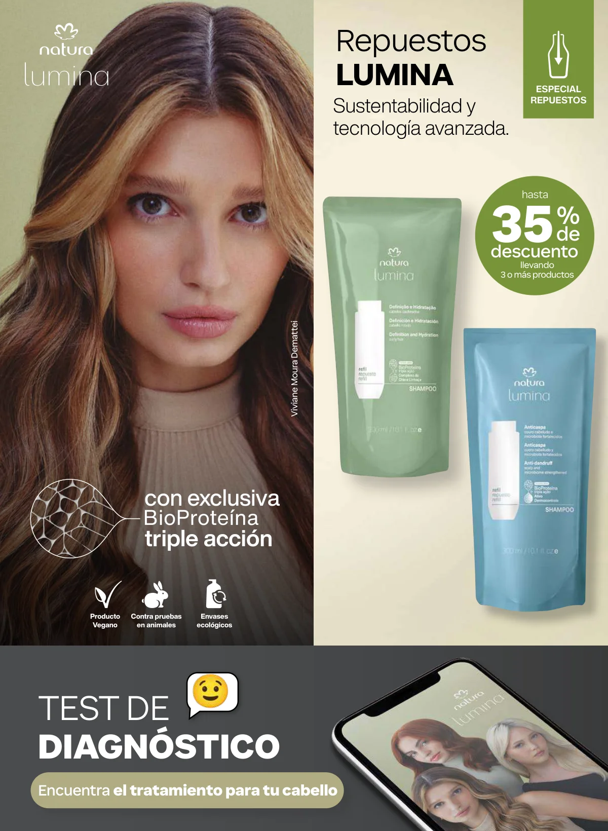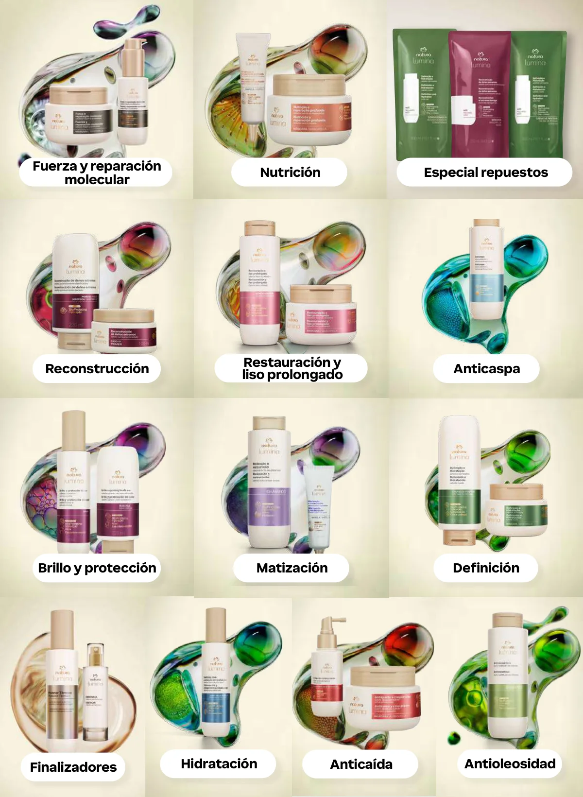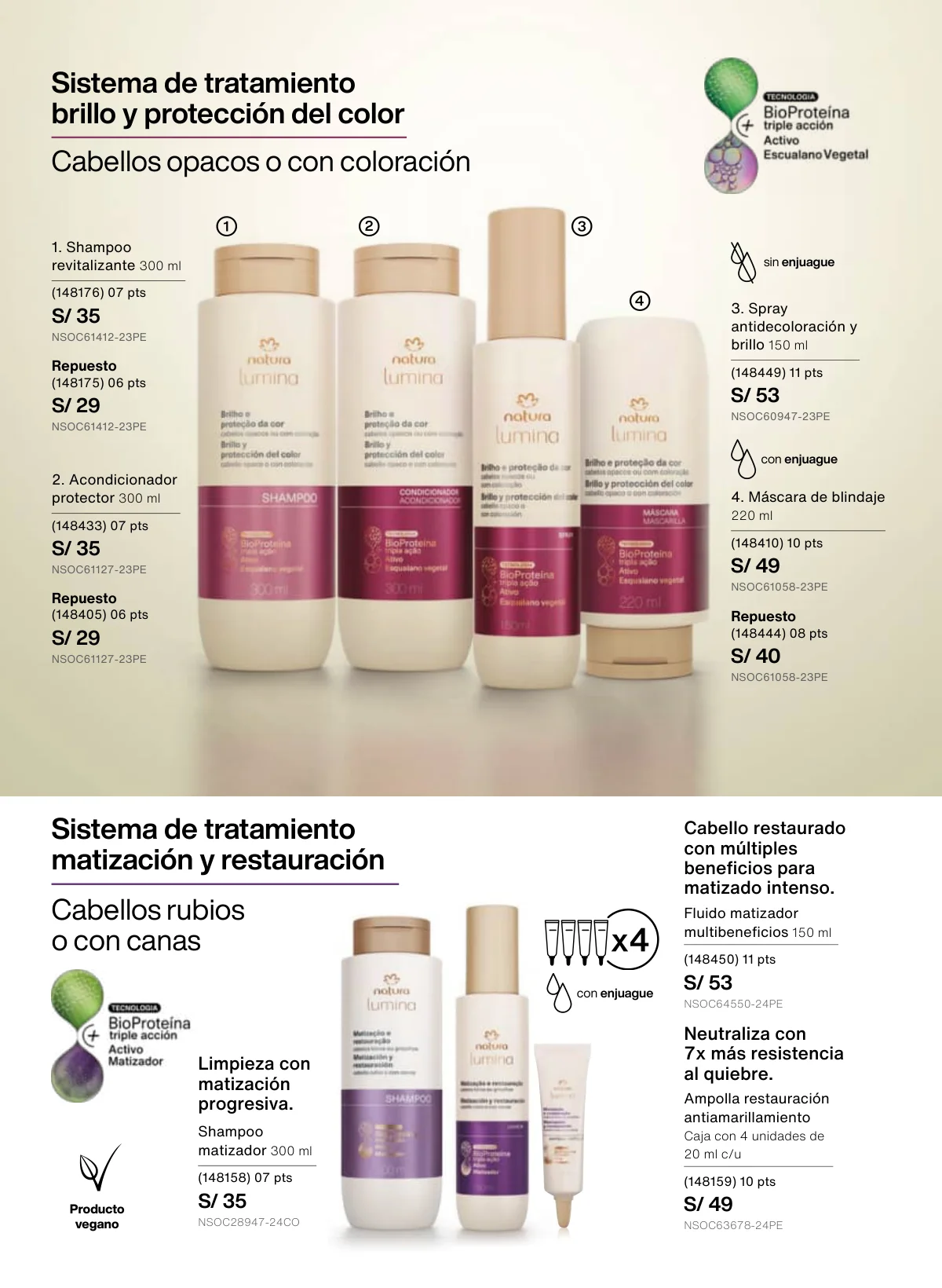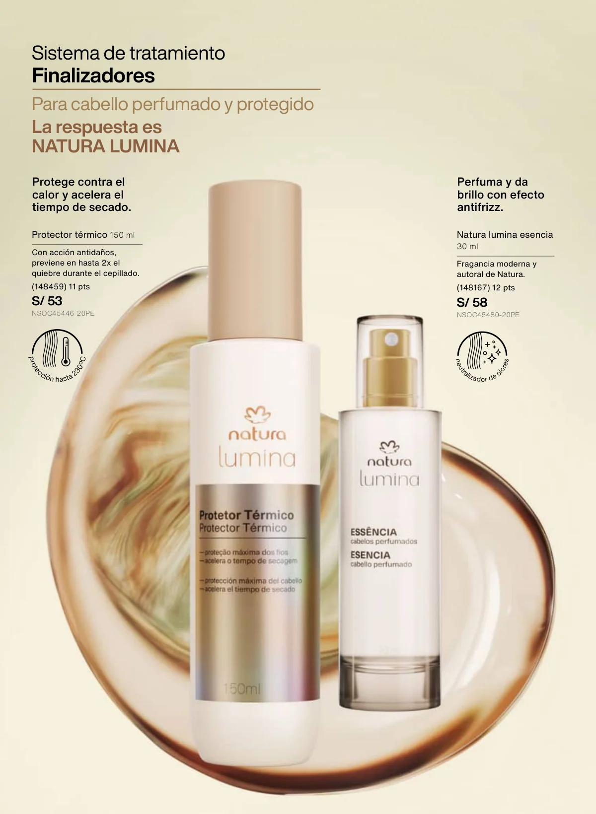 - Lumina es otra marca experta de Natura Perú dedicada al cuidado capilar. Este mes puedes revisar todos los tratamientos (shampoo, máscara, crema de peinar y más) para cada problema de tu cabello.