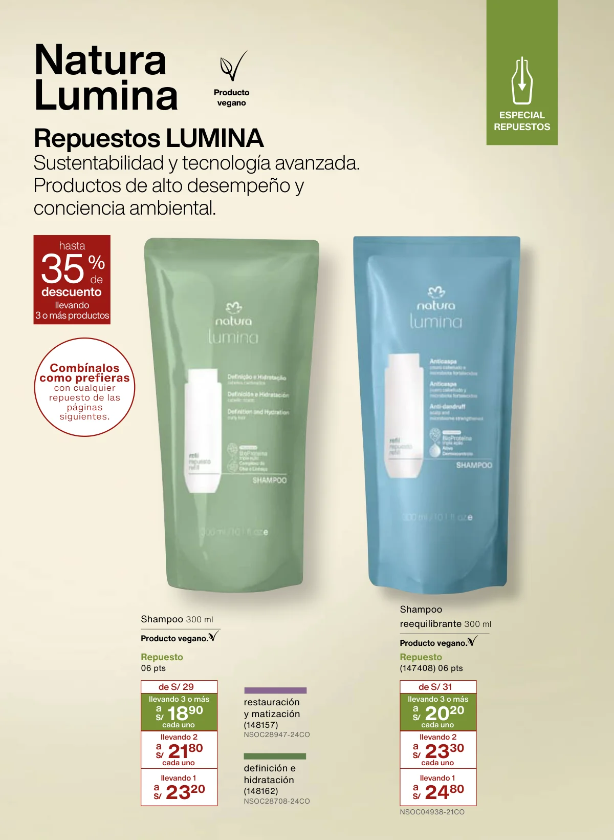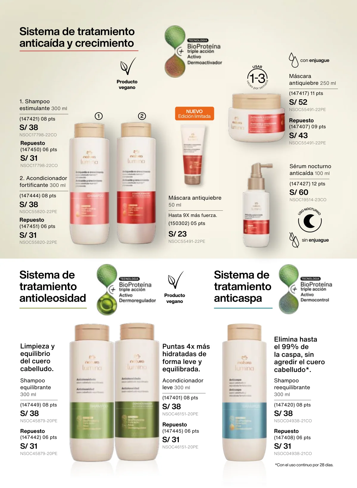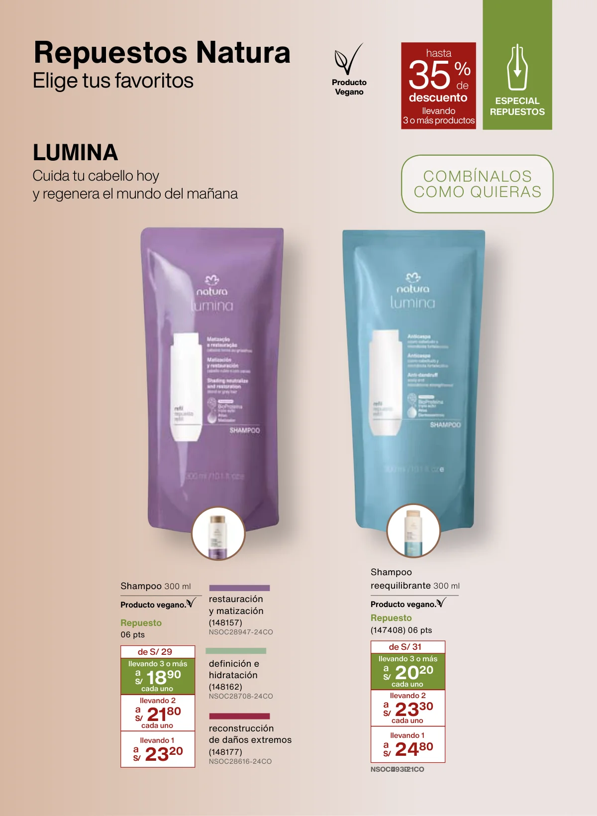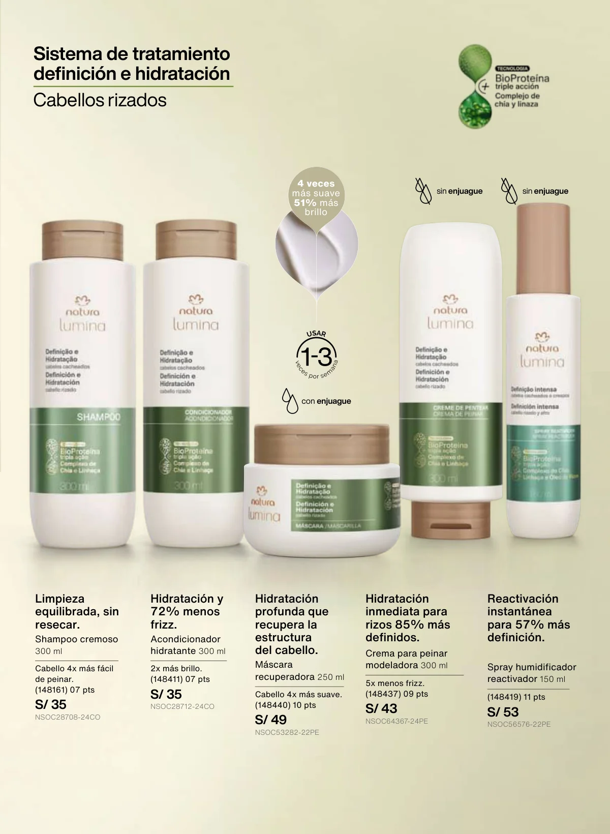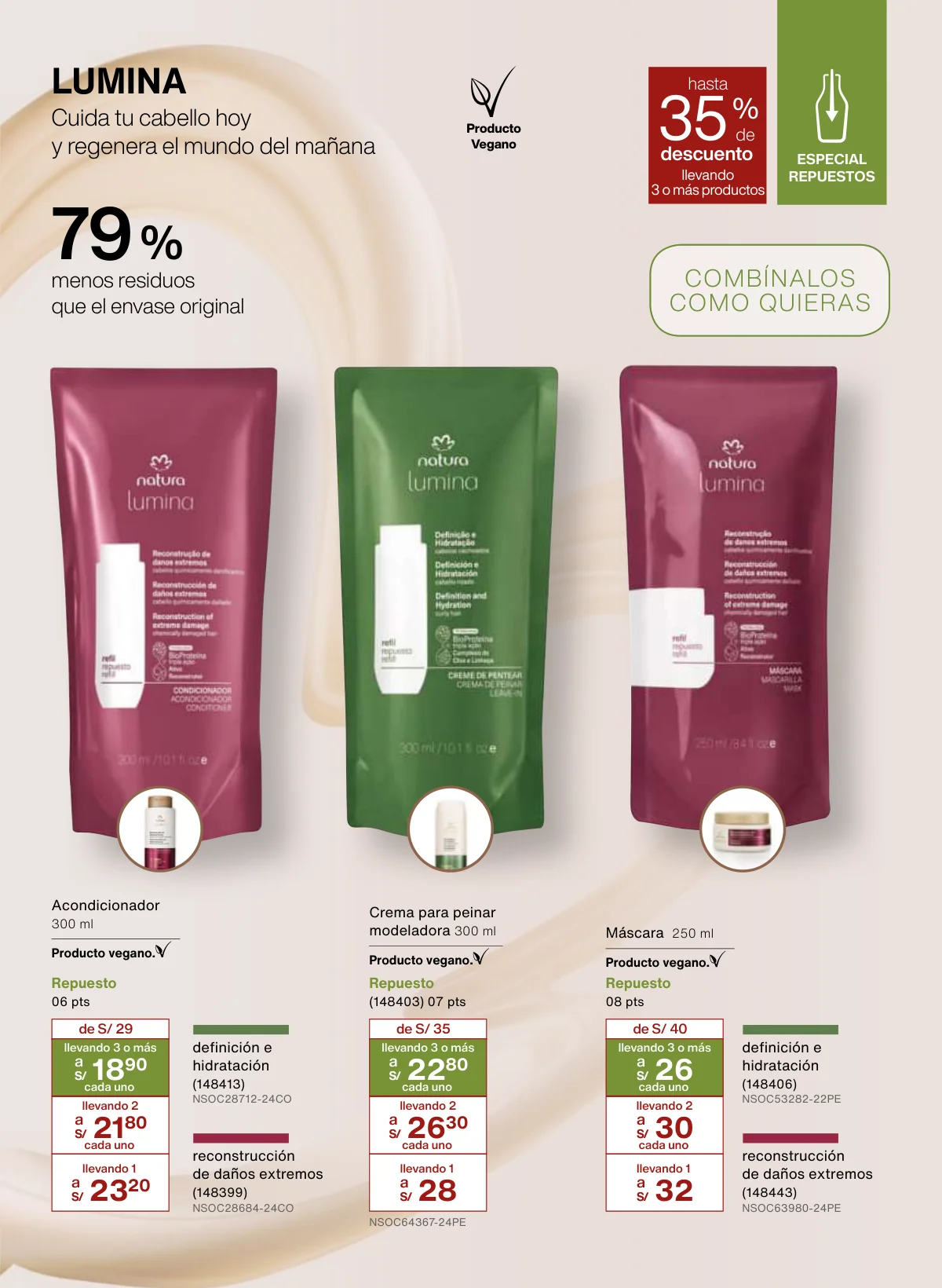 - Lumina es otra marca experta de Natura Perú dedicada al cuidado capilar. Este mes puedes revisar todos los tratamientos (shampoo, máscara, crema de peinar y más) para cada problema de tu cabello.