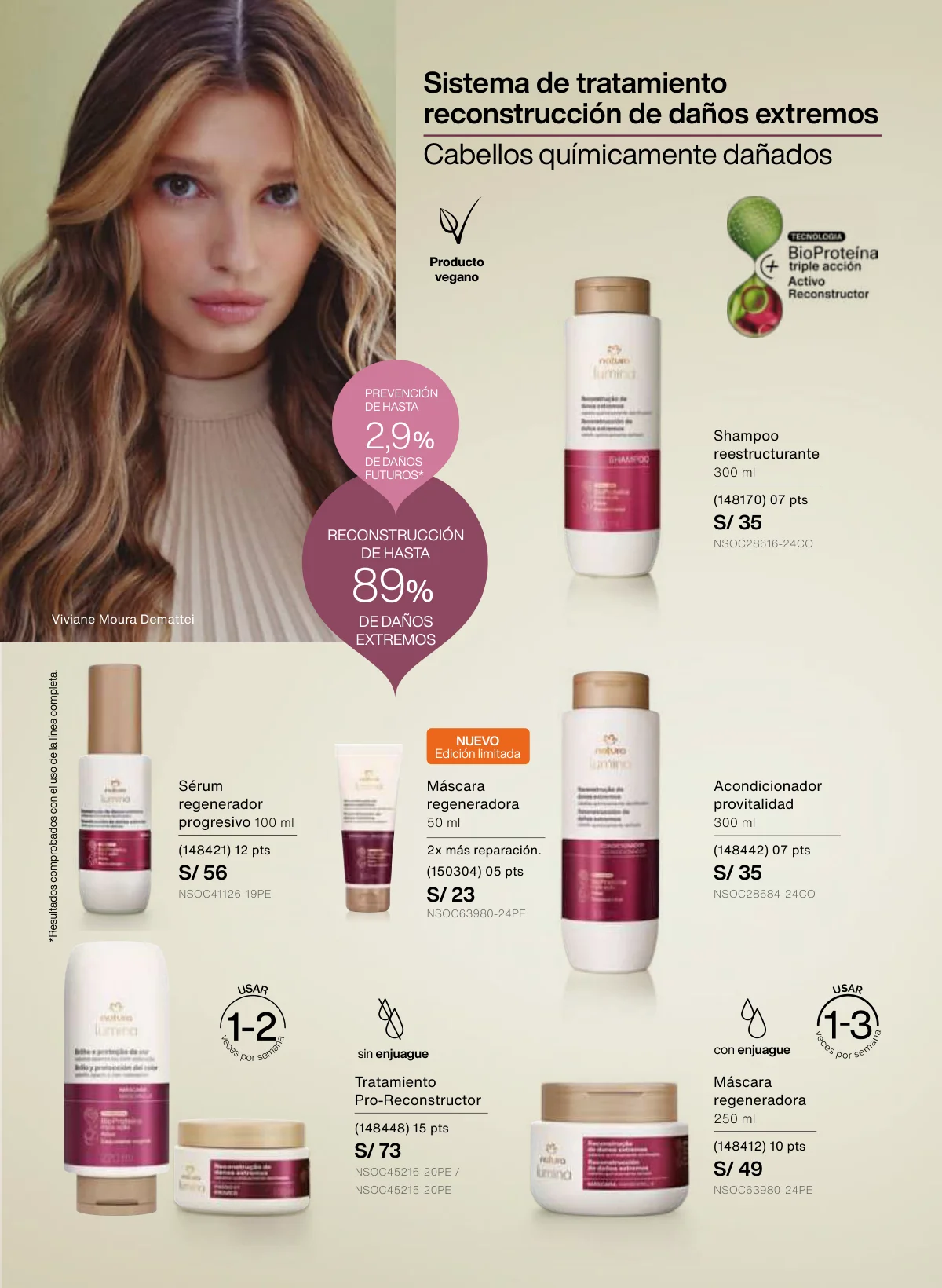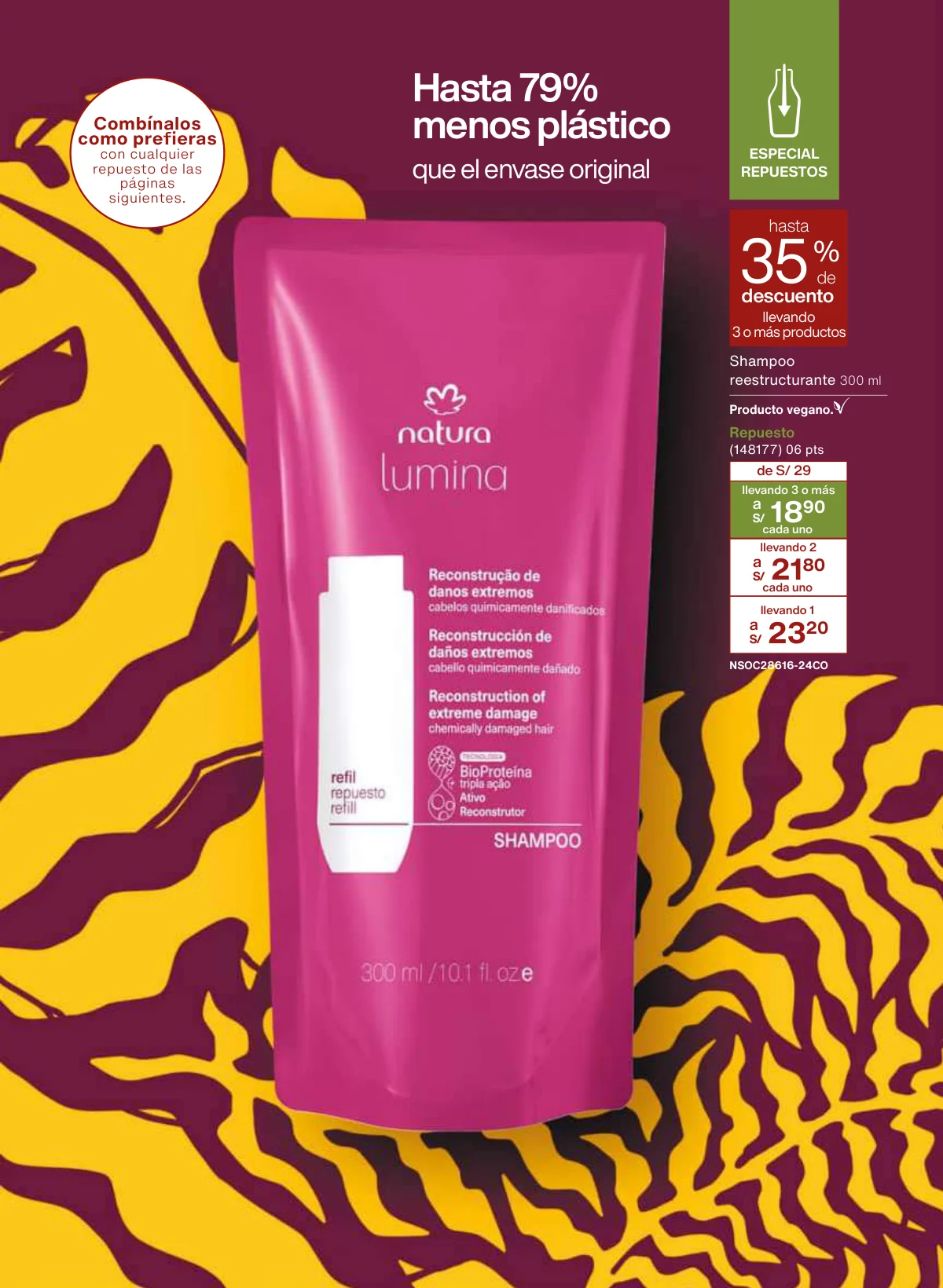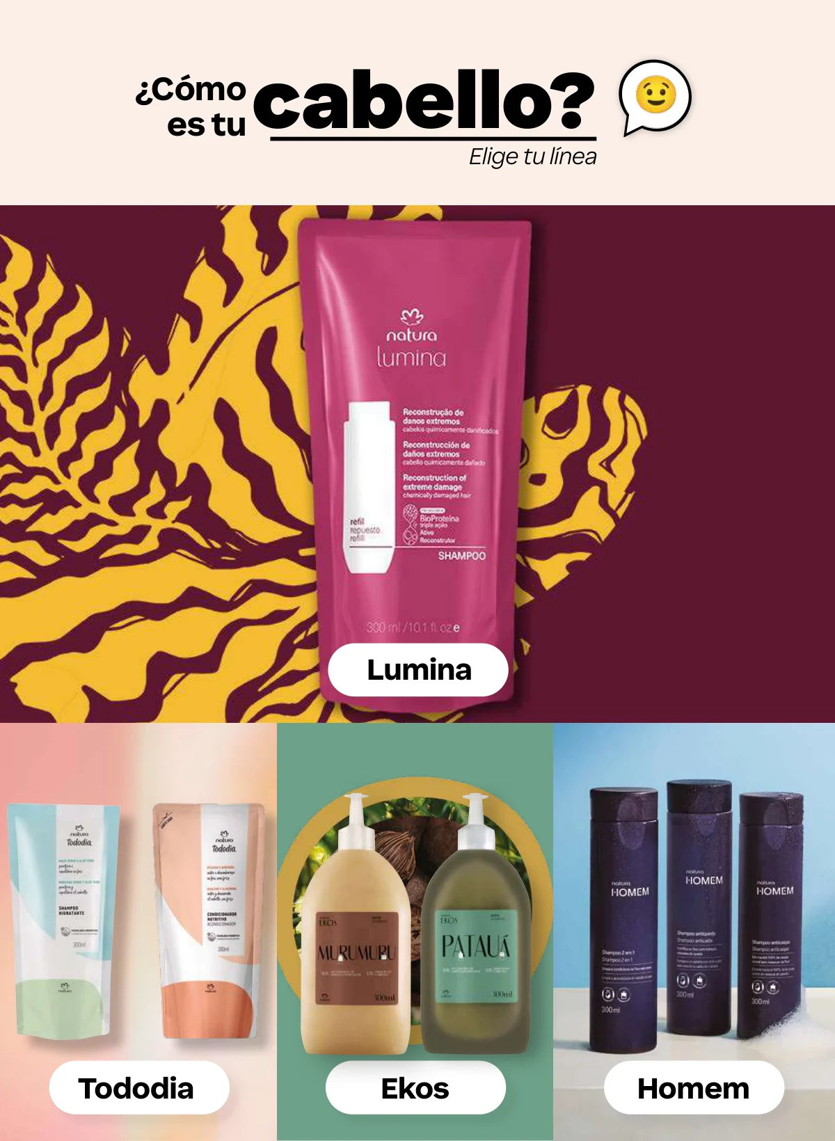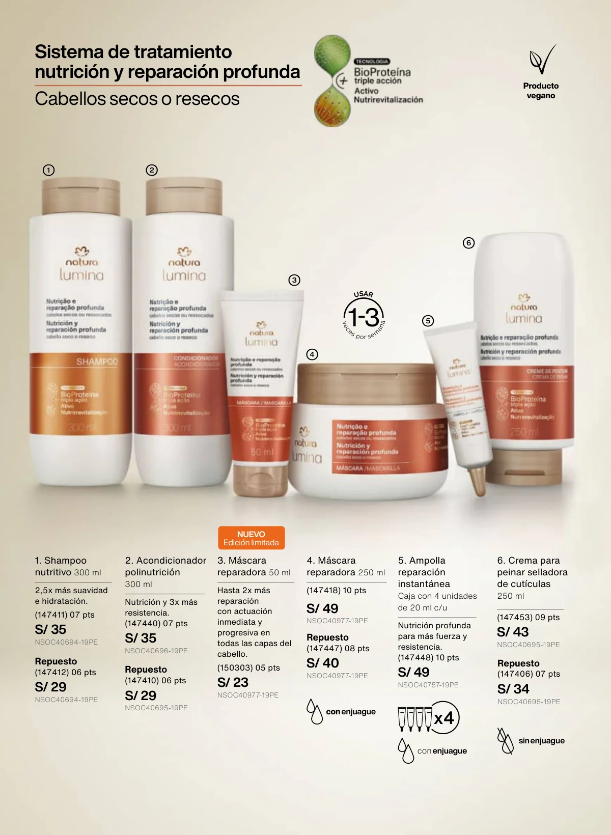 - Lumina es otra marca experta de Natura Perú dedicada al cuidado capilar. Este mes puedes revisar todos los tratamientos (shampoo, máscara, crema de peinar y más) para cada problema de tu cabello.