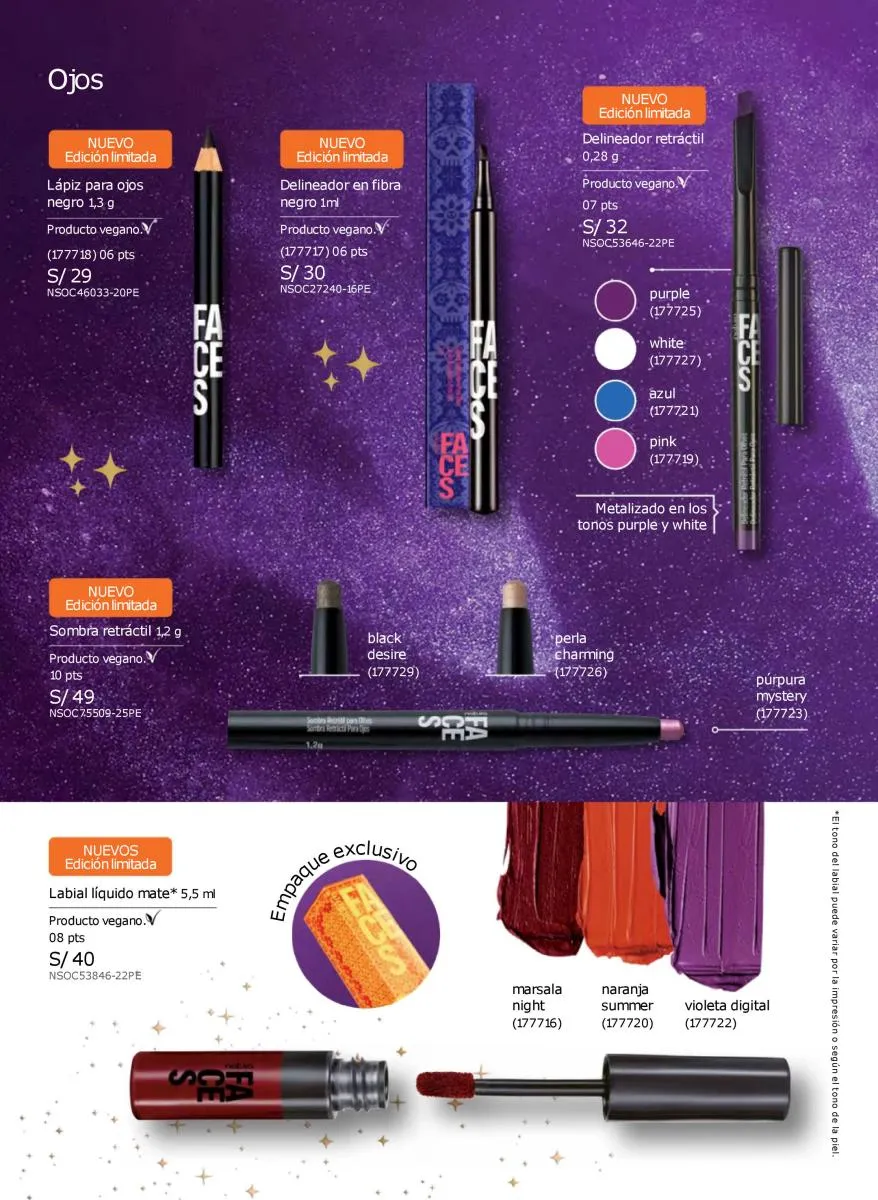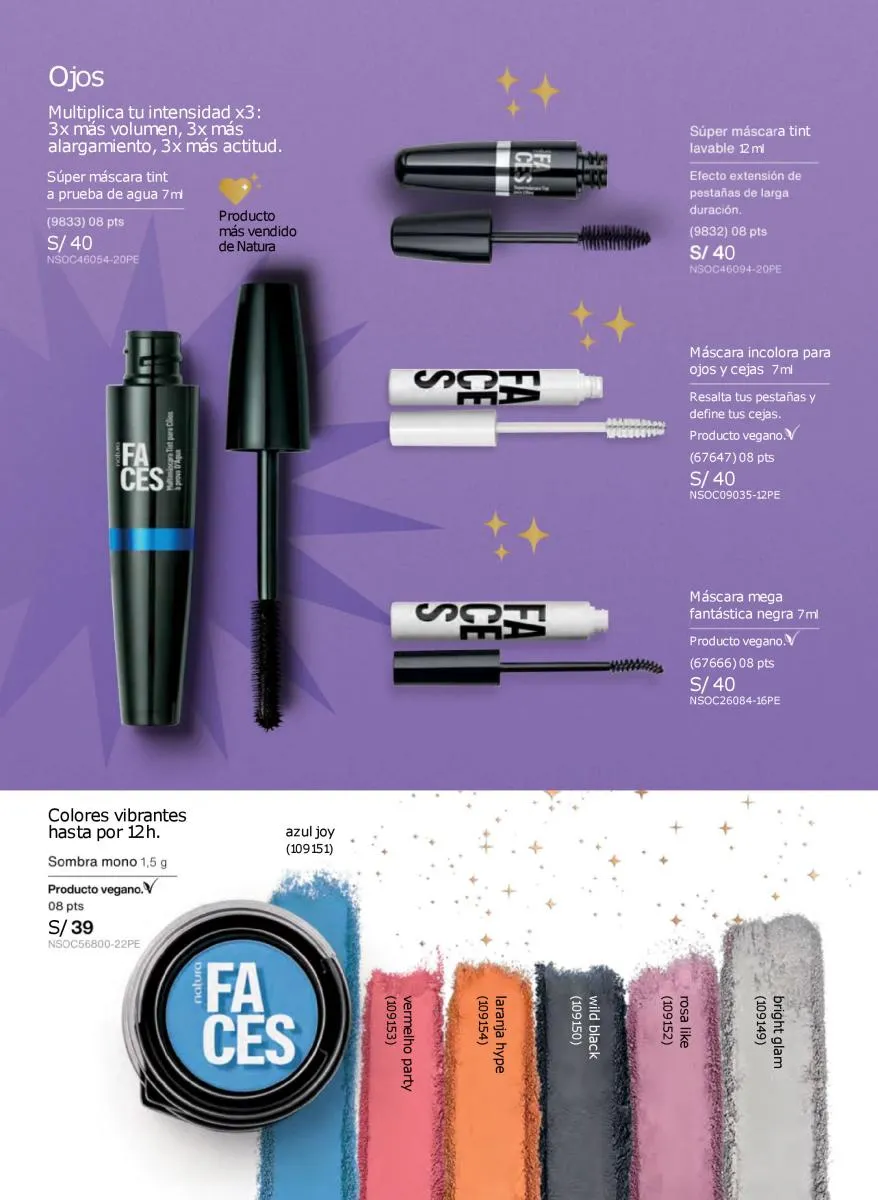 Para esa mirada impactante, las sombras, delineadores y máscaras son justo lo que requieres para resaltar entre todos los demás. Faces también te ayuda en este sentido con toda su línea profesional de cosmética: bases, labiales, esmaltes y mucho más.