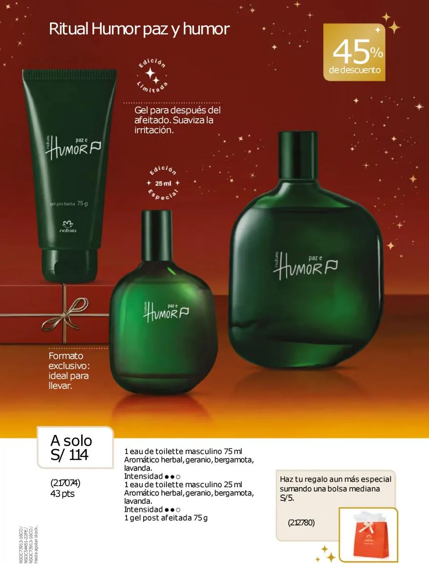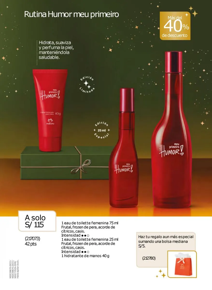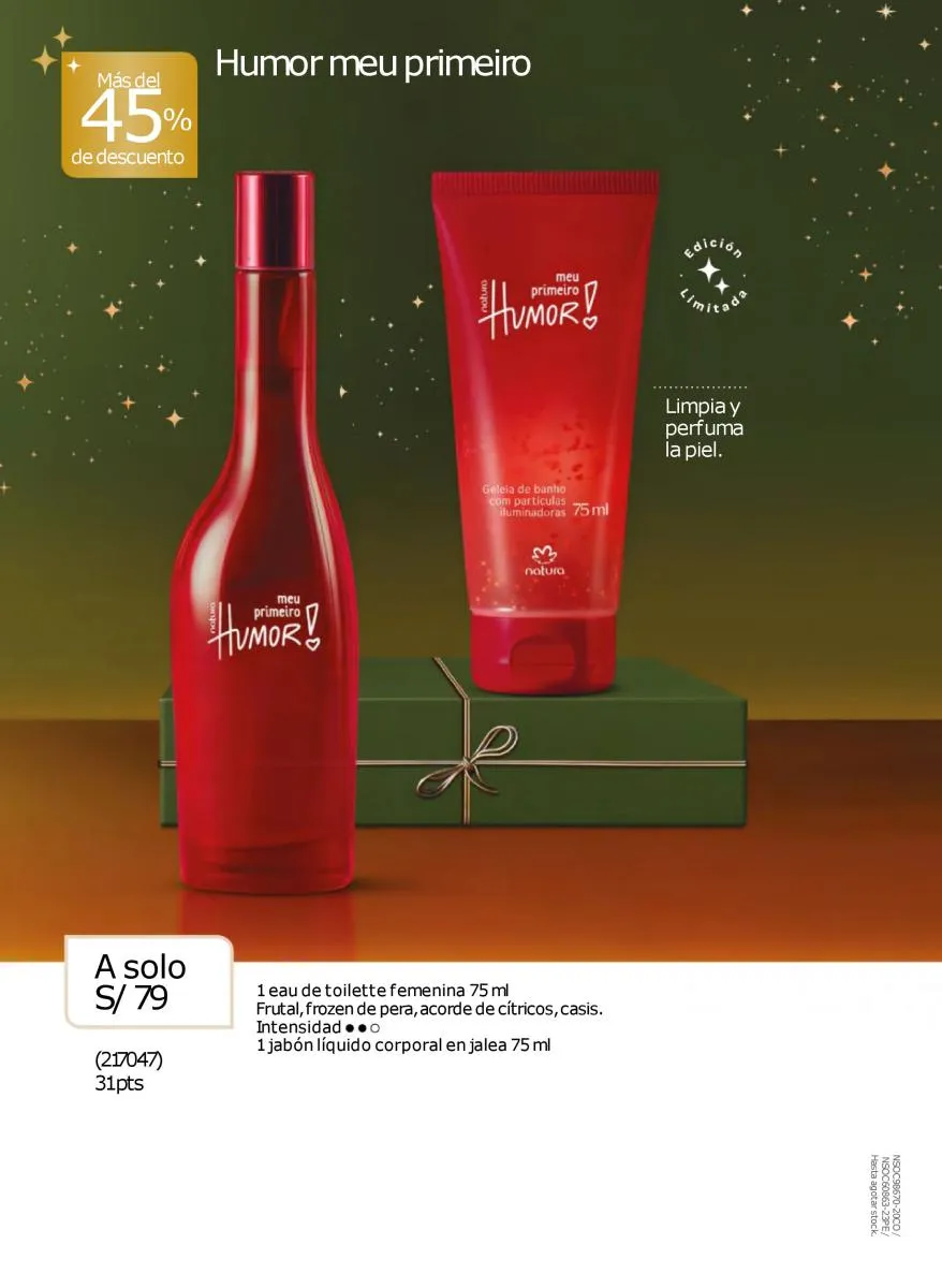 - Humor es otra fantástica sugerencia para este catálogo Natura ciclo 17 2025. Puedes llevar el duo de su eau de parfum con su hidratante corporal a un 35% off.