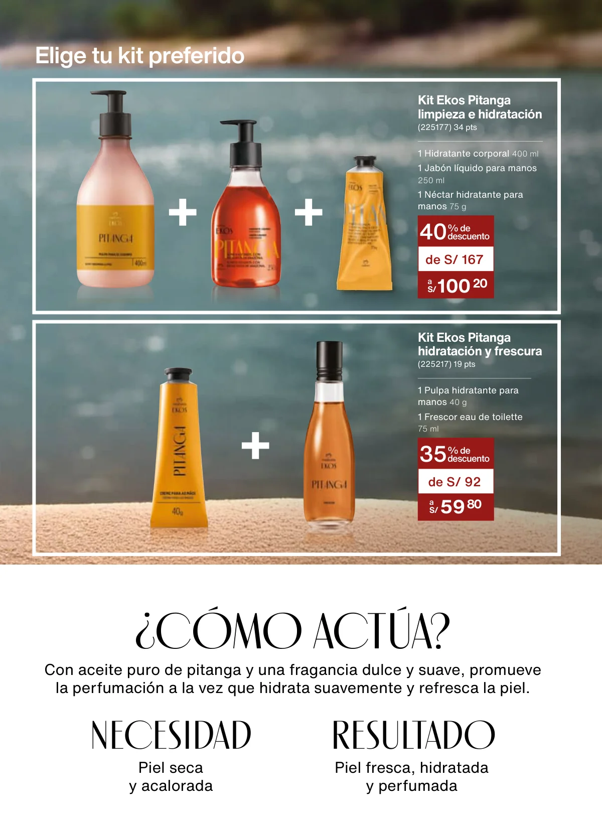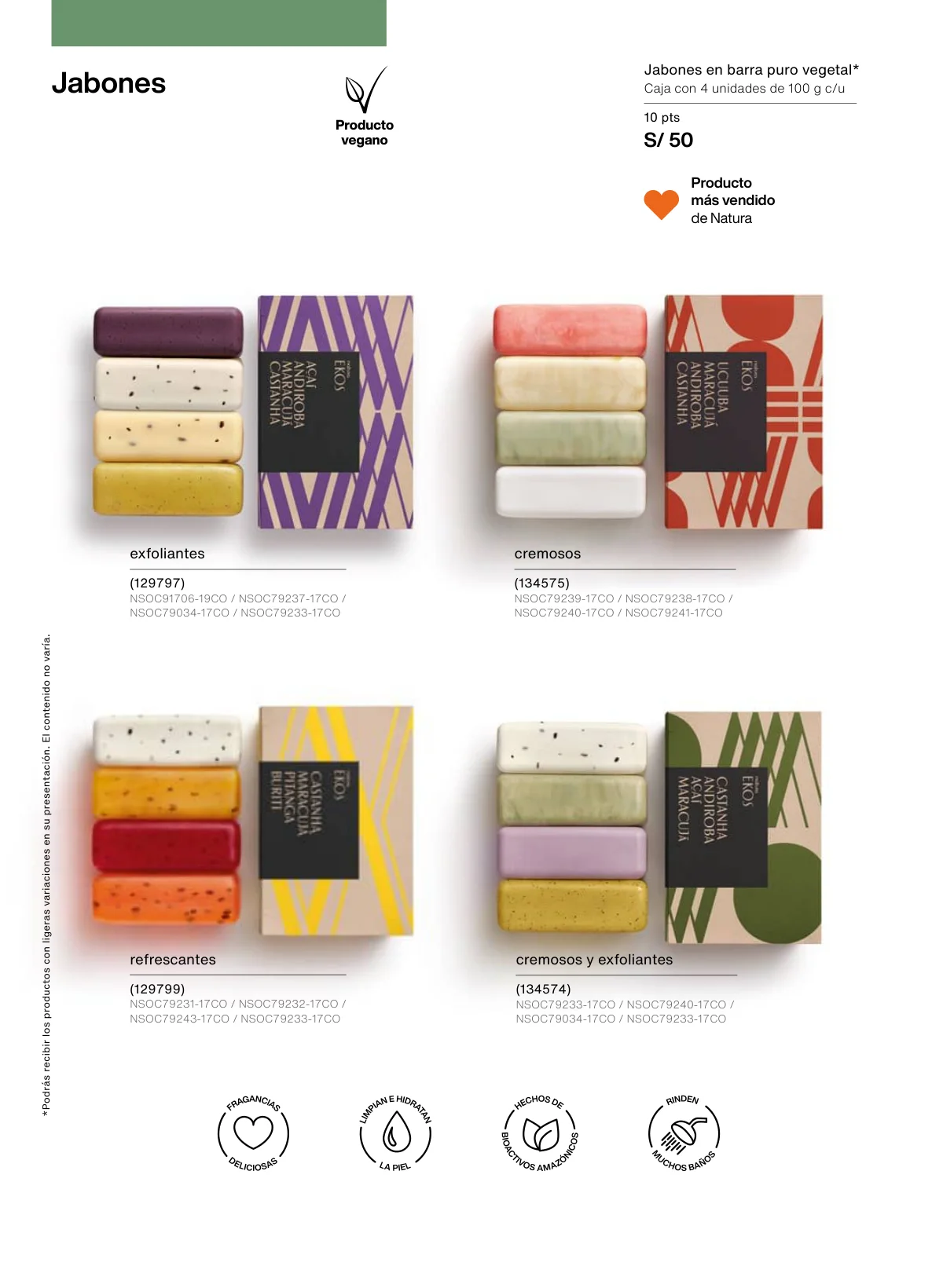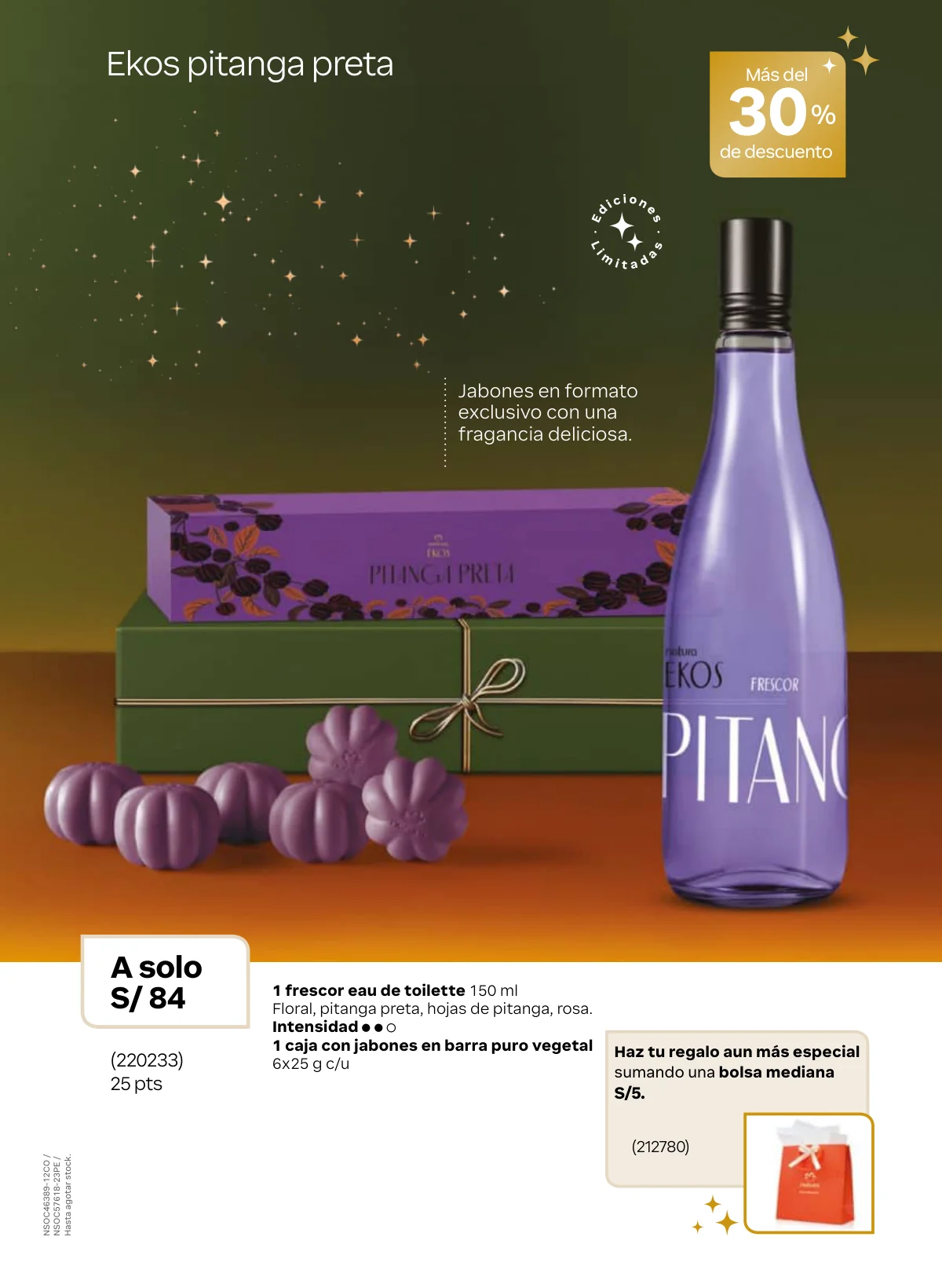 - Otra marcar insigne es Ekos y como regalo especial Natura te da la opción de llevar en una hermosa caja un set de fragancia de Pitanga de frescor y dos jabones: uno corporal y otro de manos.