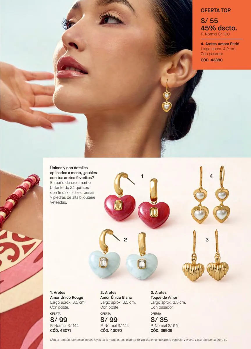 - Expresa todo el amor que sientes por ella con los Aretes colgantes Cora, corazones reversibles, infaltables para un look digno de San Valentín. Una cara elaborada con baño de oro de 24 quilates y otra con acabado de marfil perlado. Pag 33.