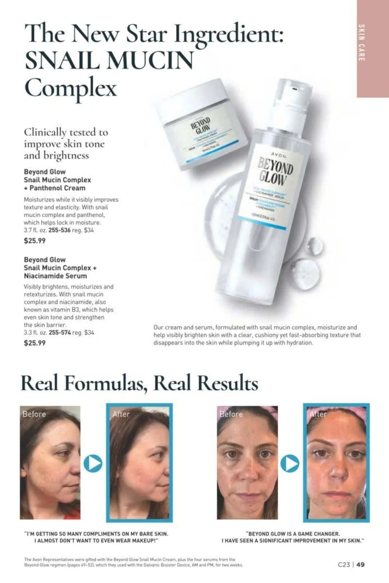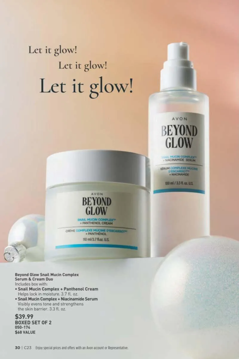 If hydration and radiance are your skin goals, Avon’s Beyond Glow series delivers with cutting-edge ingredients. The Snail Mucin Complex Duo includes a moisturizing cream and a serum infused with niacinamide and panthenol. Together, they work to lock in moisture, smooth texture, and visibly even skin tone. Ideal for daily use, this pair supports your skin barrier while delivering a dewy, plumped finish.