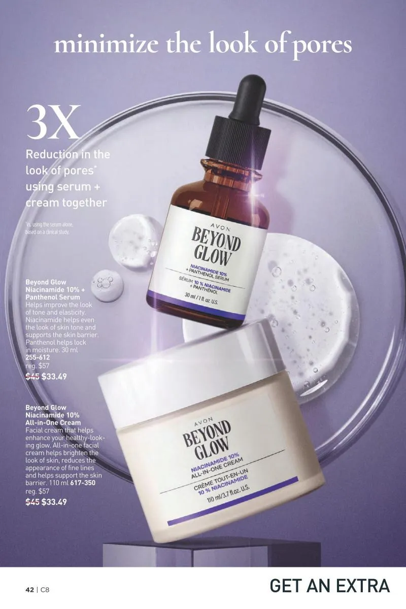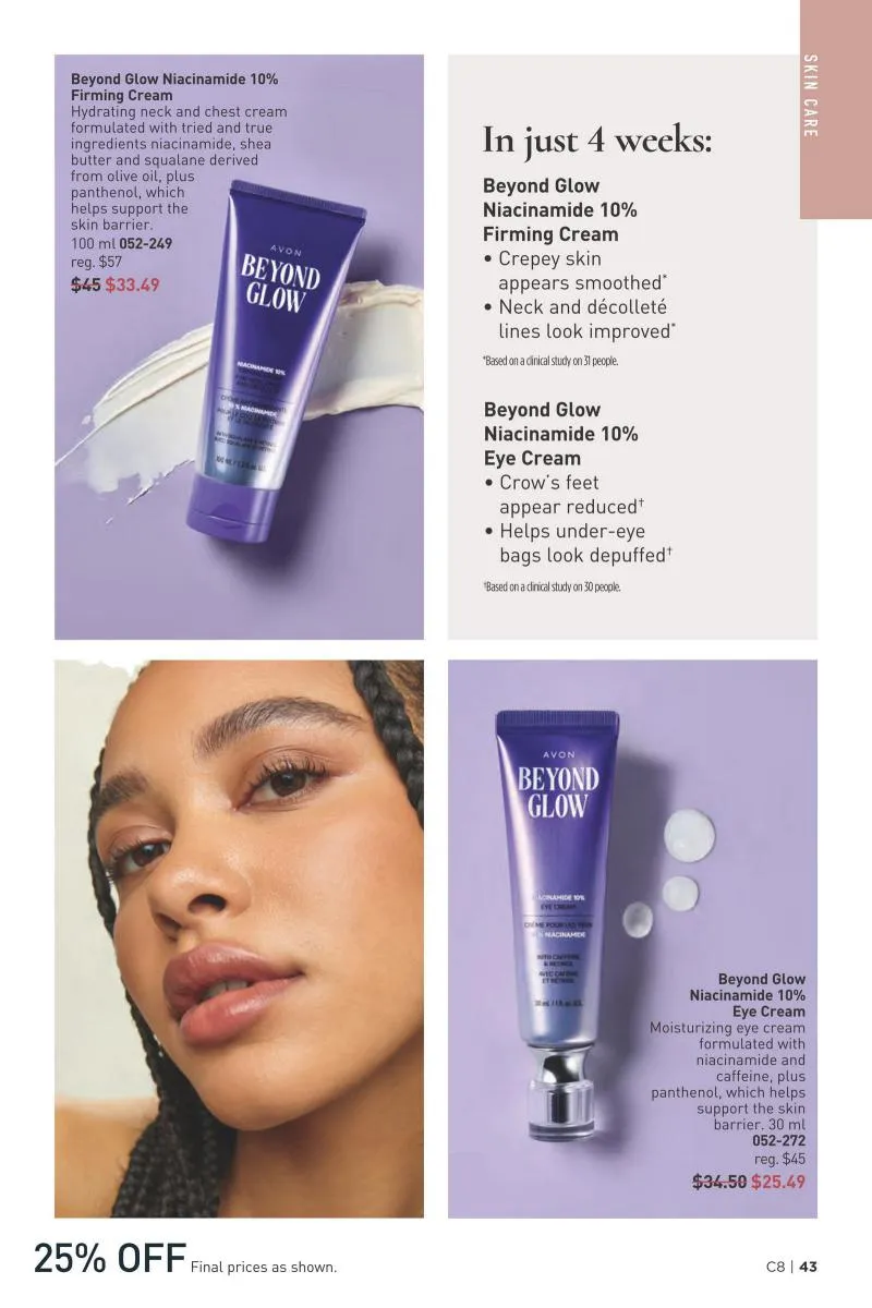 Niacinamide, or vitamin B3, plays a starring role in Avon campaign 8 2026. Avon’s Beyond Glow Niacinamide collection offers a variety of targeted treatments for different needs. The Niacinamide 2% Cream Mist delivers a burst of hydration anytime, perfect for on-the-go refreshment. Meanwhile, the Niacinamide 10% Eye Cream and Firming Cream provide rich hydration and noticeable firming results, especially for delicate under-eye areas and the neck.